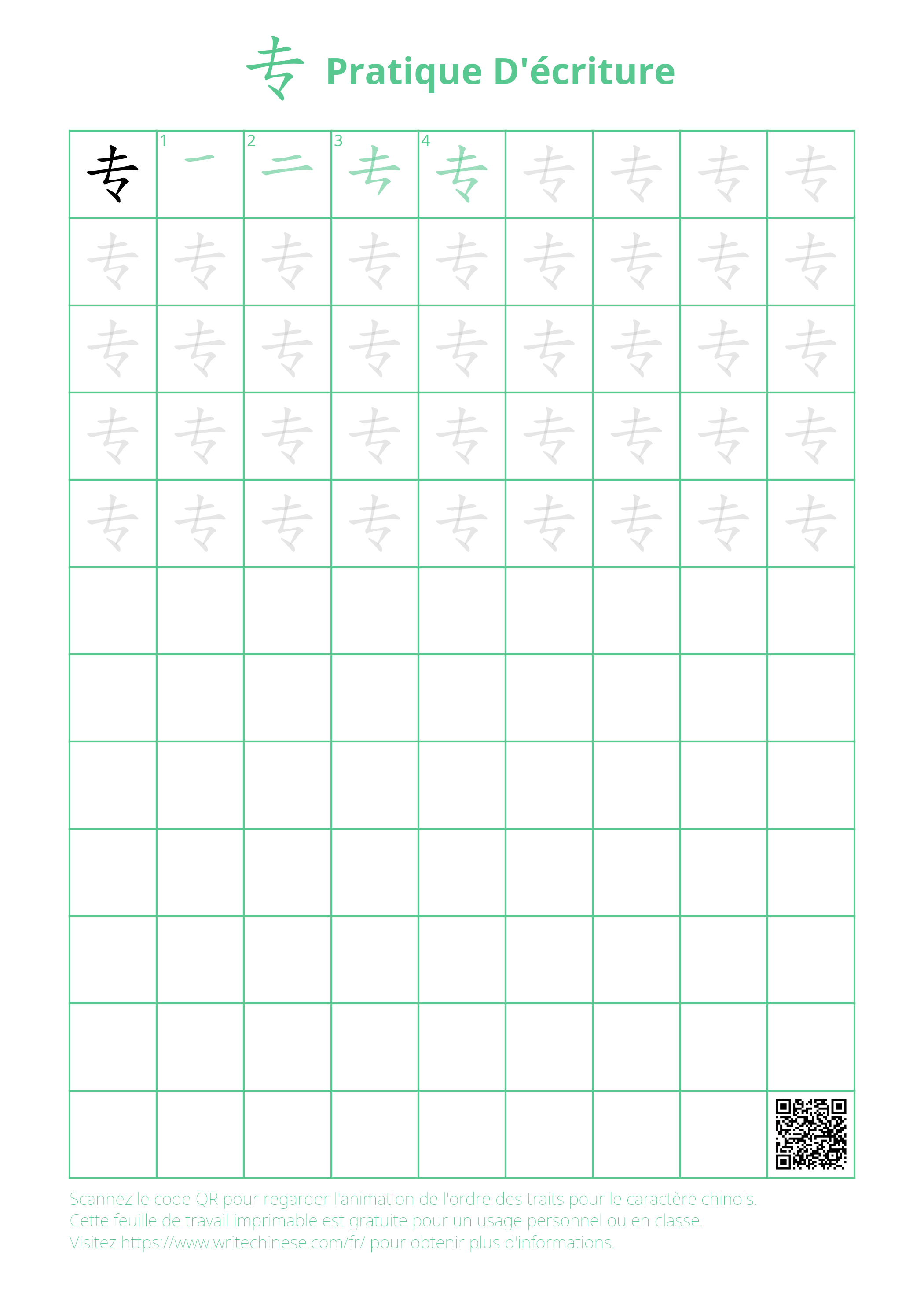 calligraphie pour écrire le caractère chinois '专'. Vous pouvez télécharger les fiches