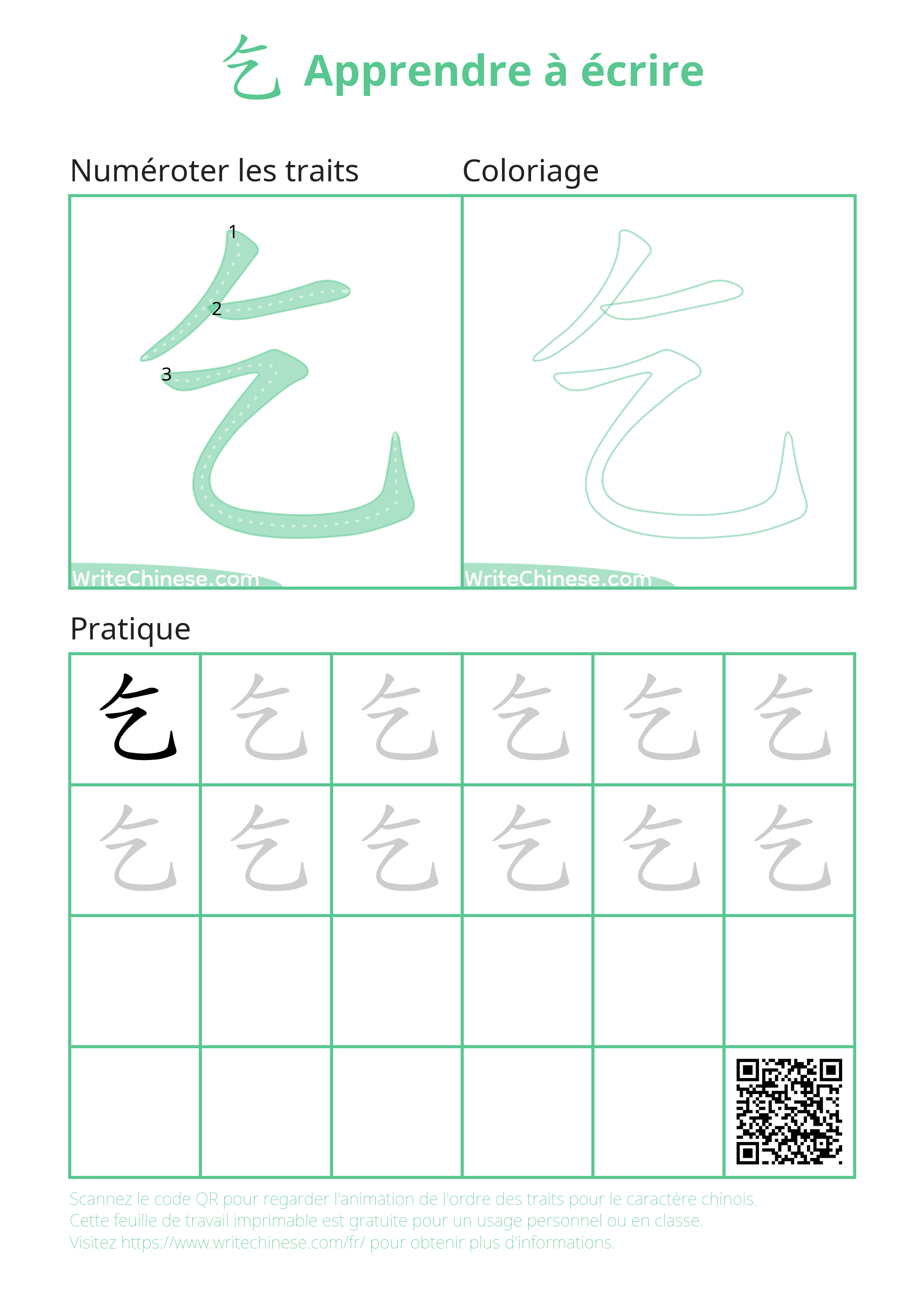 Apprenez la bonne manière d'écrire le caractère chinois '乞' grâce à un tutoriel vidéo avec un professeur de calligraphie. Suivez le guide étape par étape du maître de la calligraphie pour écrire le caractère chinois '乞'. Vous pouvez télécharger les fiches d'écriture manuscrite imprimables ci-dessous et pratiquer en écrivant avec un stylo et du papier.