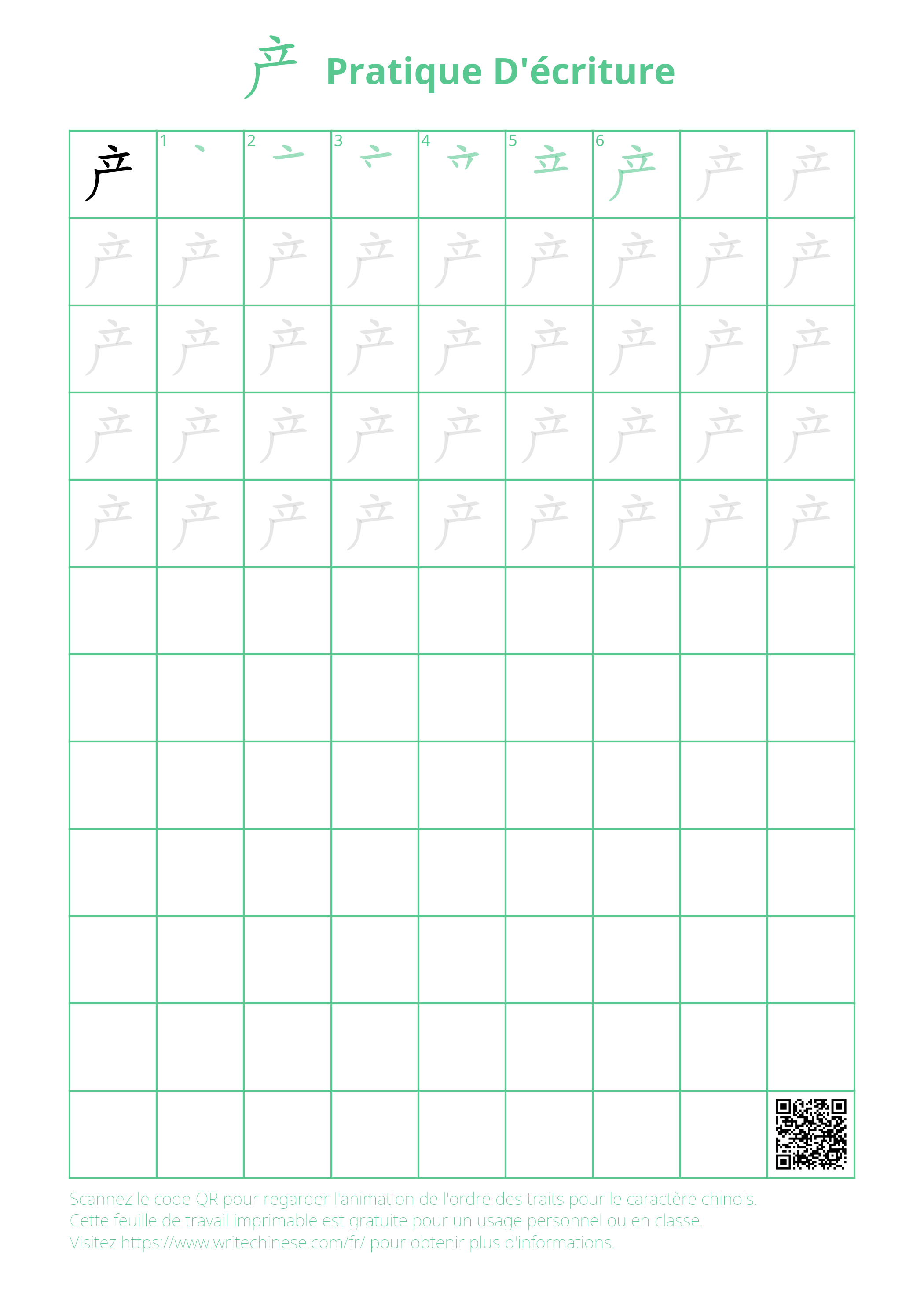 calligraphie pour écrire le caractère chinois '产'. Vous pouvez télécharger les fiches