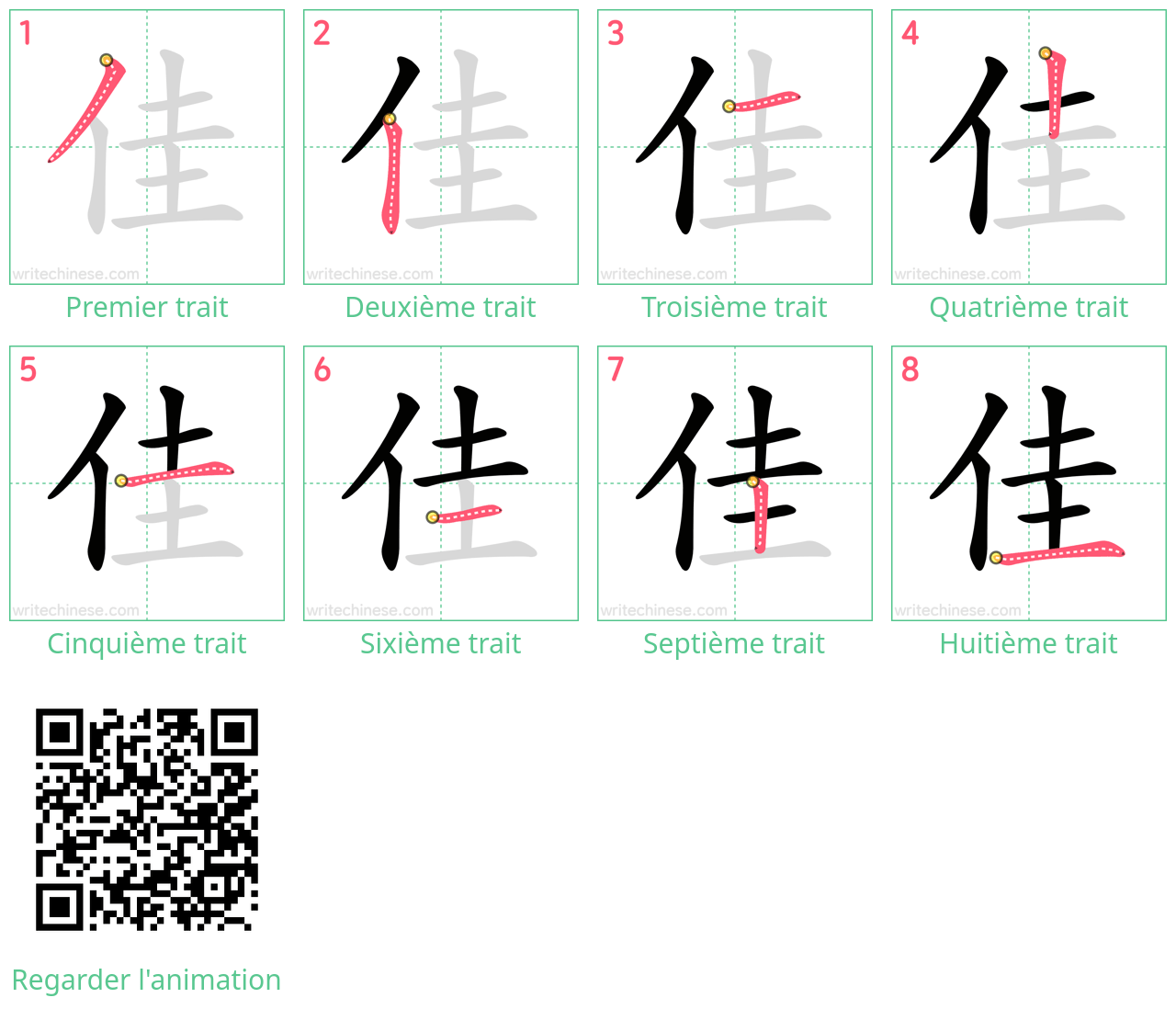 Apprenez à écrire le caractère chinois "佳" en regardant l'animation de l'ordre des traits