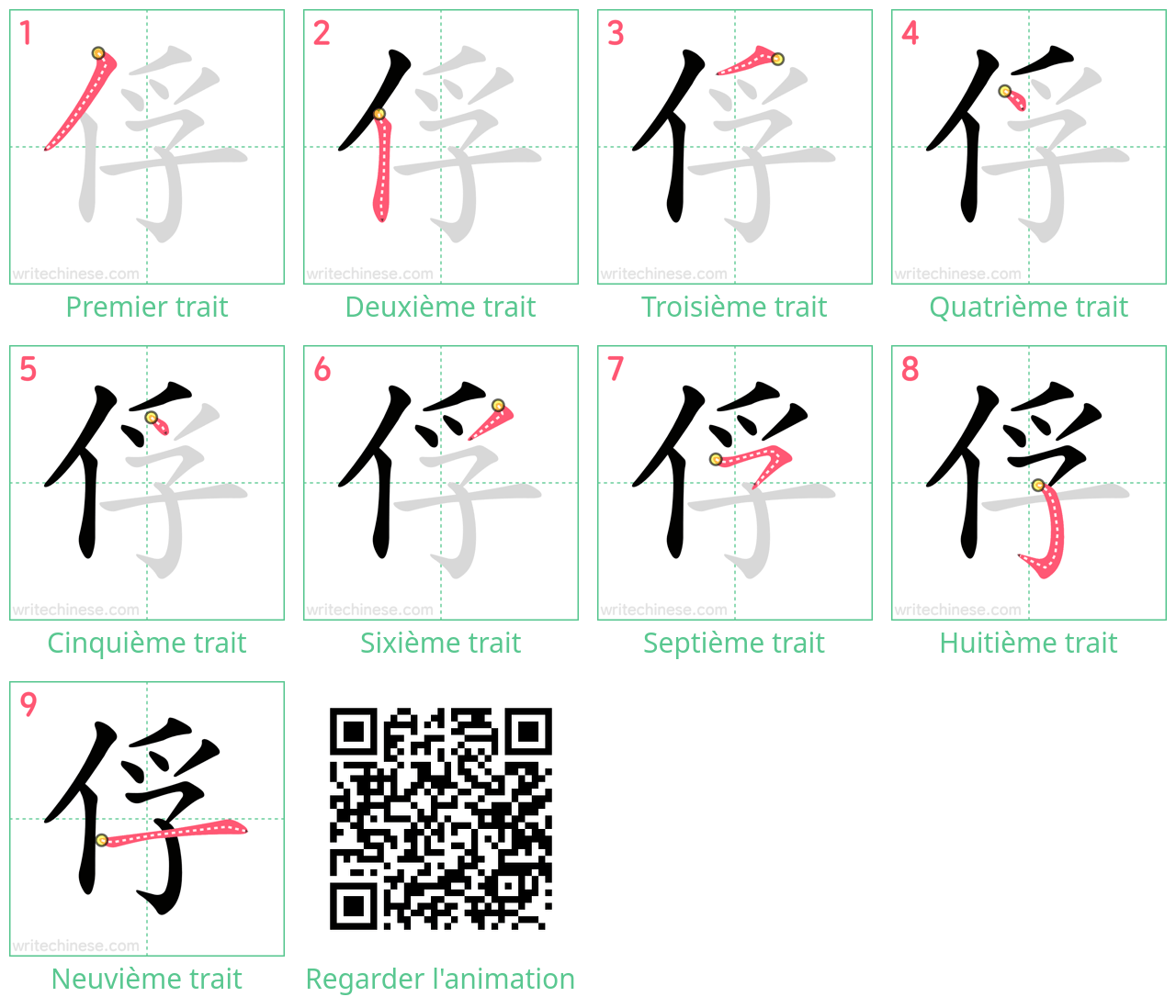 Apprenez à écrire le caractère chinois "俘" en regardant l'animation de l'ordre des traits