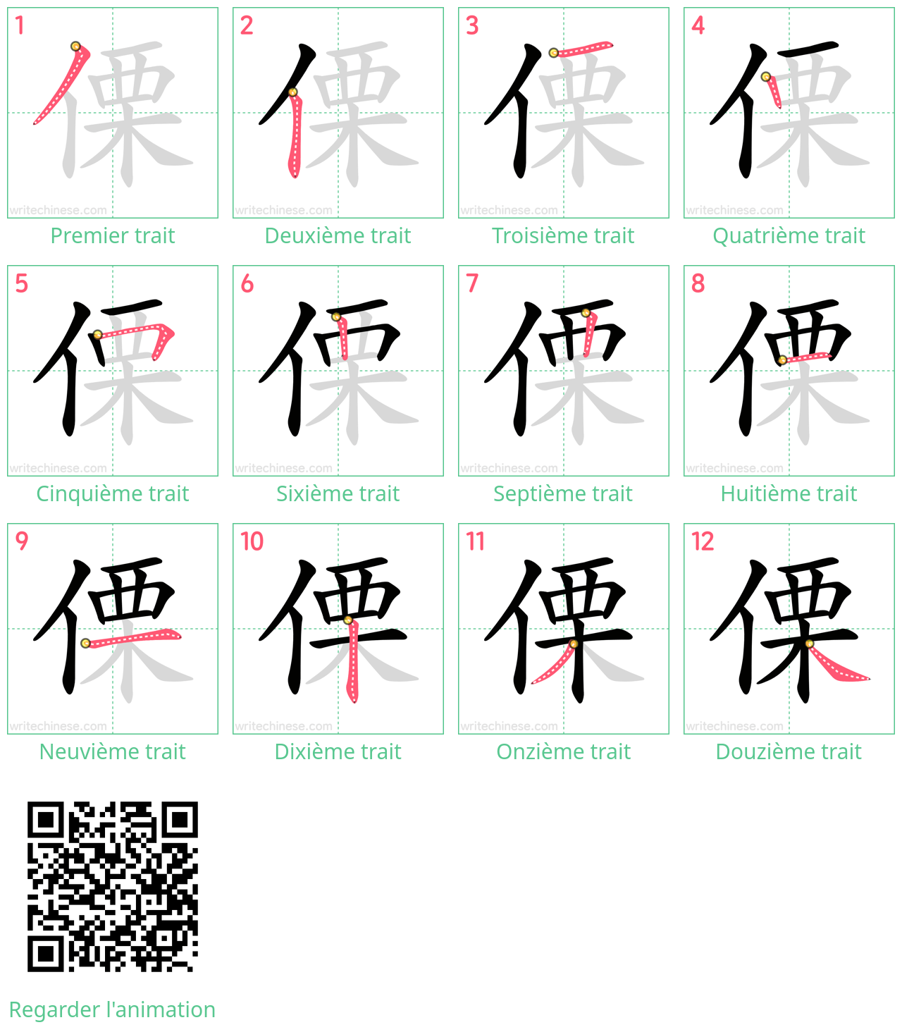 Apprenez à écrire le caractère chinois "傈" en regardant l'animation de l'ordre des traits