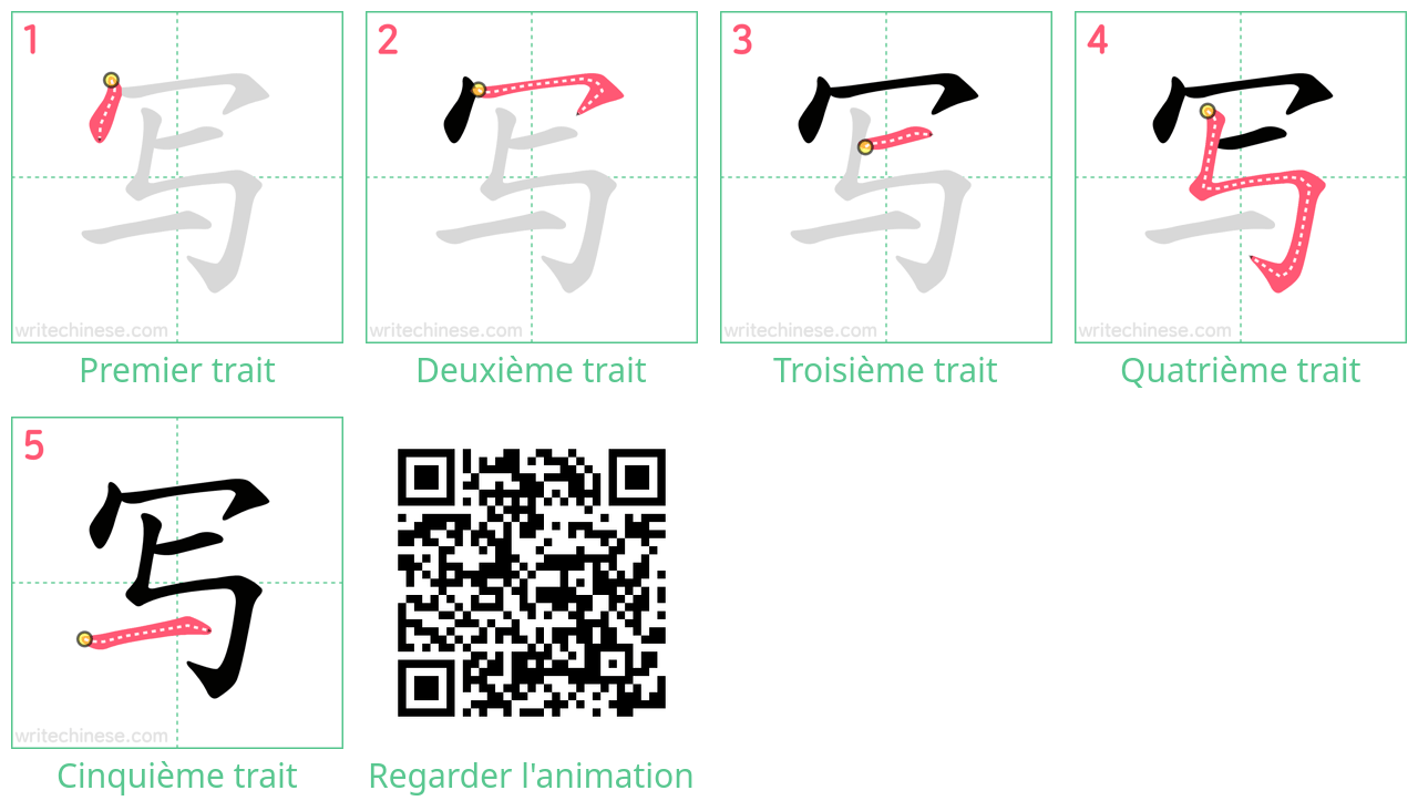 Apprenez à écrire le caractère chinois "写" en regardant l'animation de l'ordre des traits