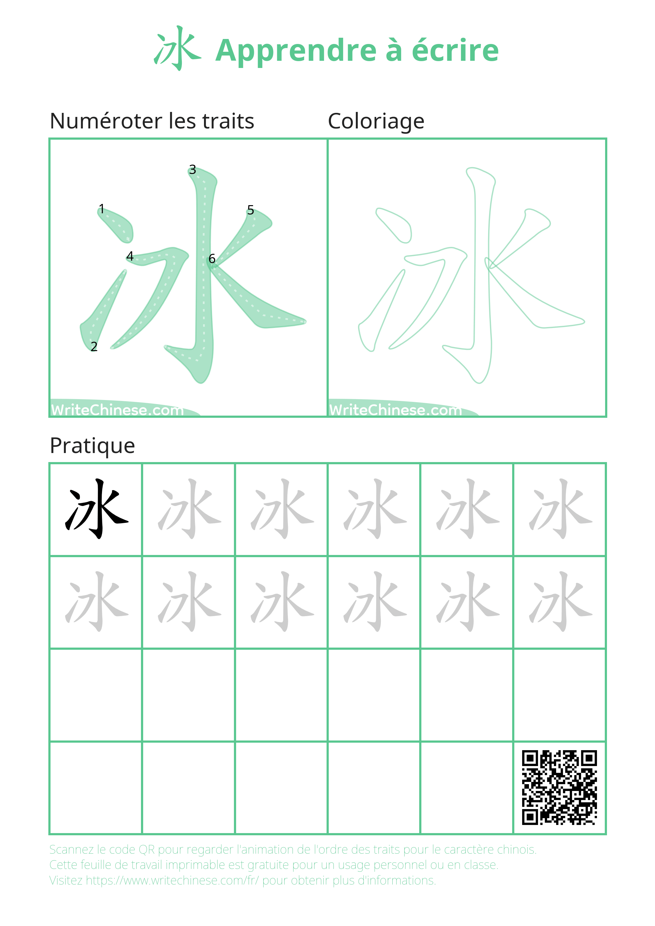 calligraphie pour écrire le caractère chinois '冰'. Vous pouvez télécharger les fiches