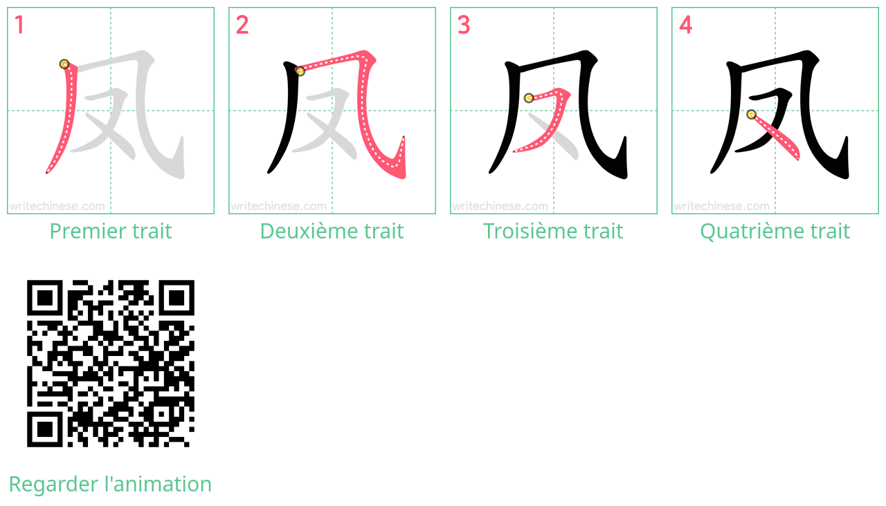 Apprenez à écrire le caractère chinois "凤" en regardant l'animation de l'ordre des traits de "凤".