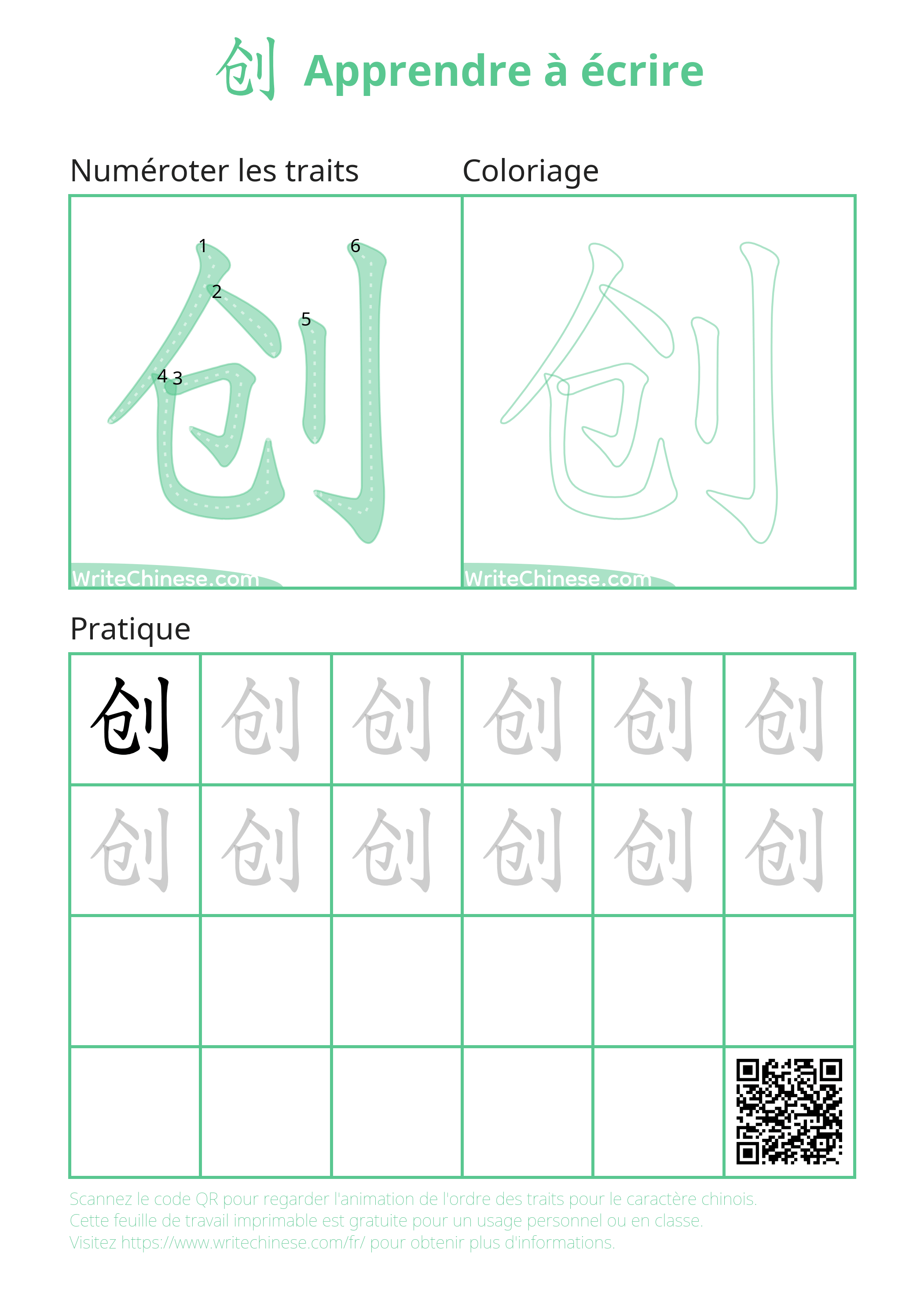 calligraphie pour écrire le caractère chinois '创'. Vous pouvez télécharger les fiches
