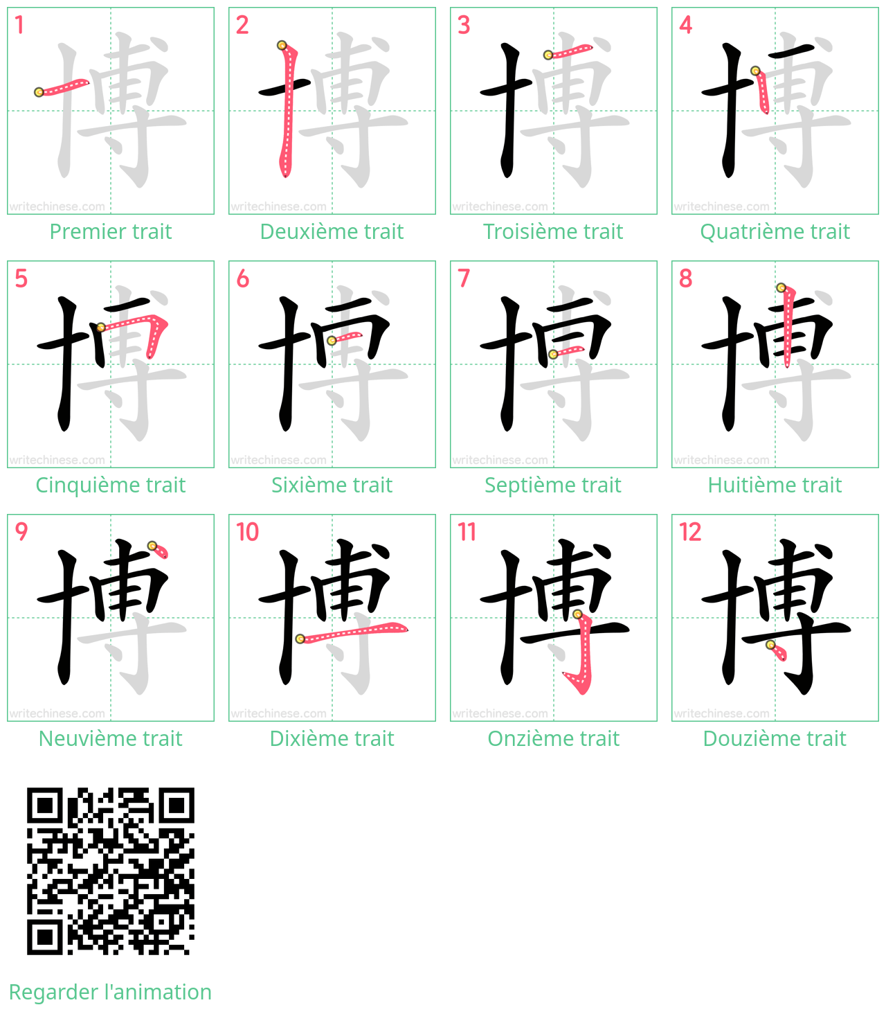 Apprenez à écrire le caractère chinois "博" en regardant l'animation de l'ordre des traits