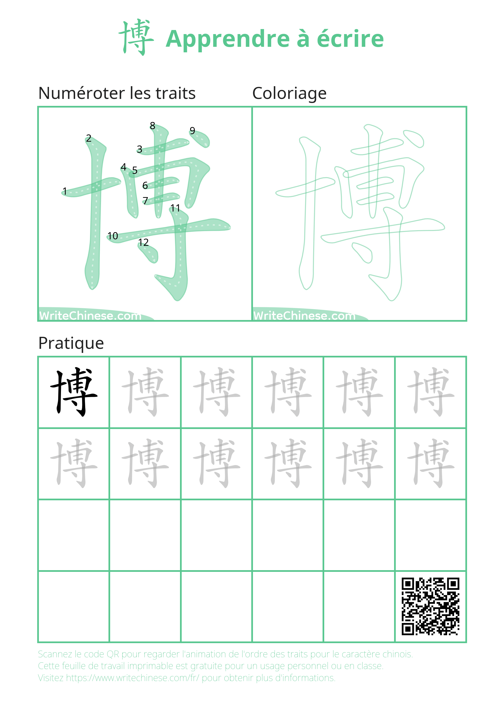 calligraphie pour écrire le caractère chinois '博'. Vous pouvez télécharger les fiches