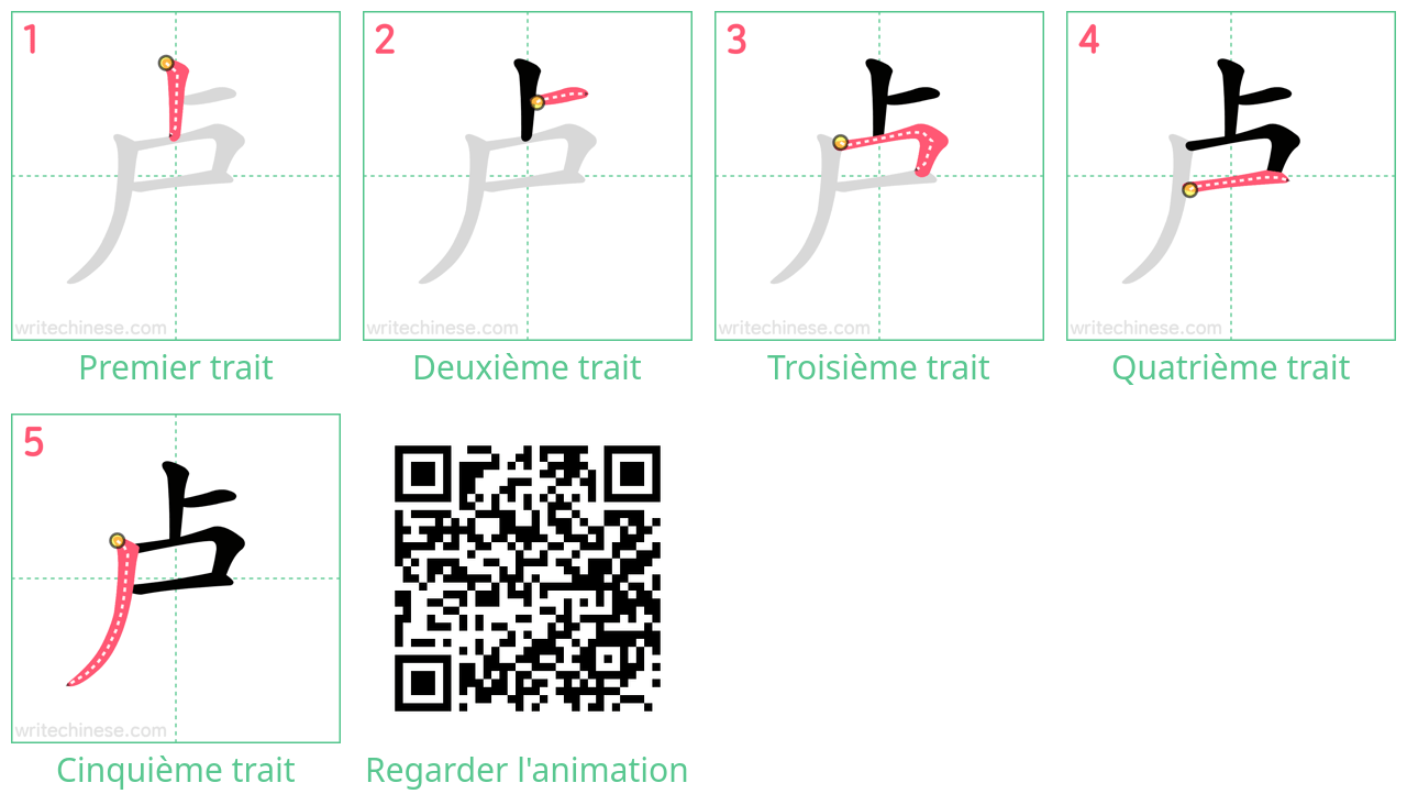 Apprenez à écrire le caractère chinois "卢" en regardant l'animation de l'ordre des traits de "卢".
