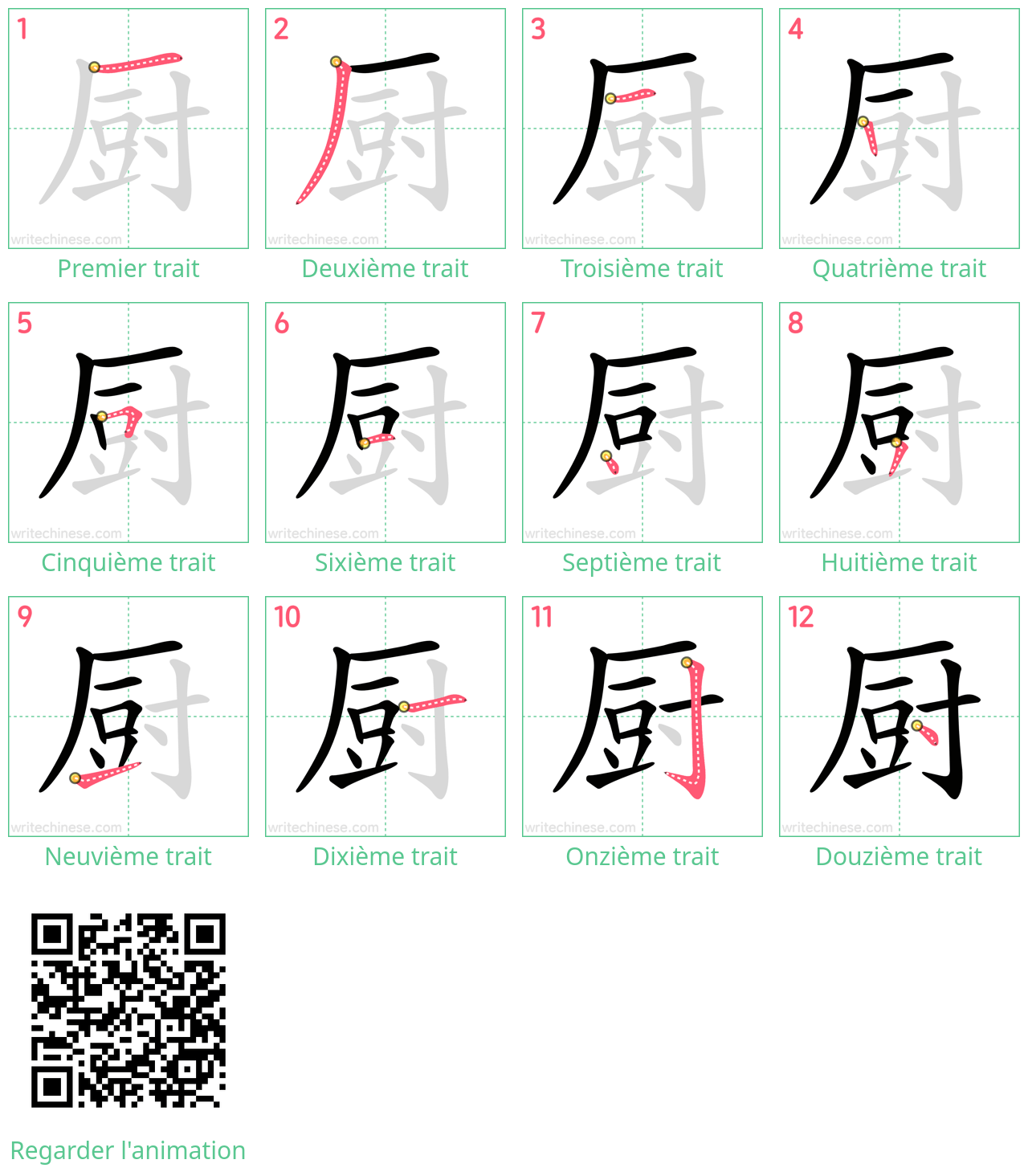 Apprenez à écrire le caractère chinois "厨" en regardant l'animation de l'ordre des traits