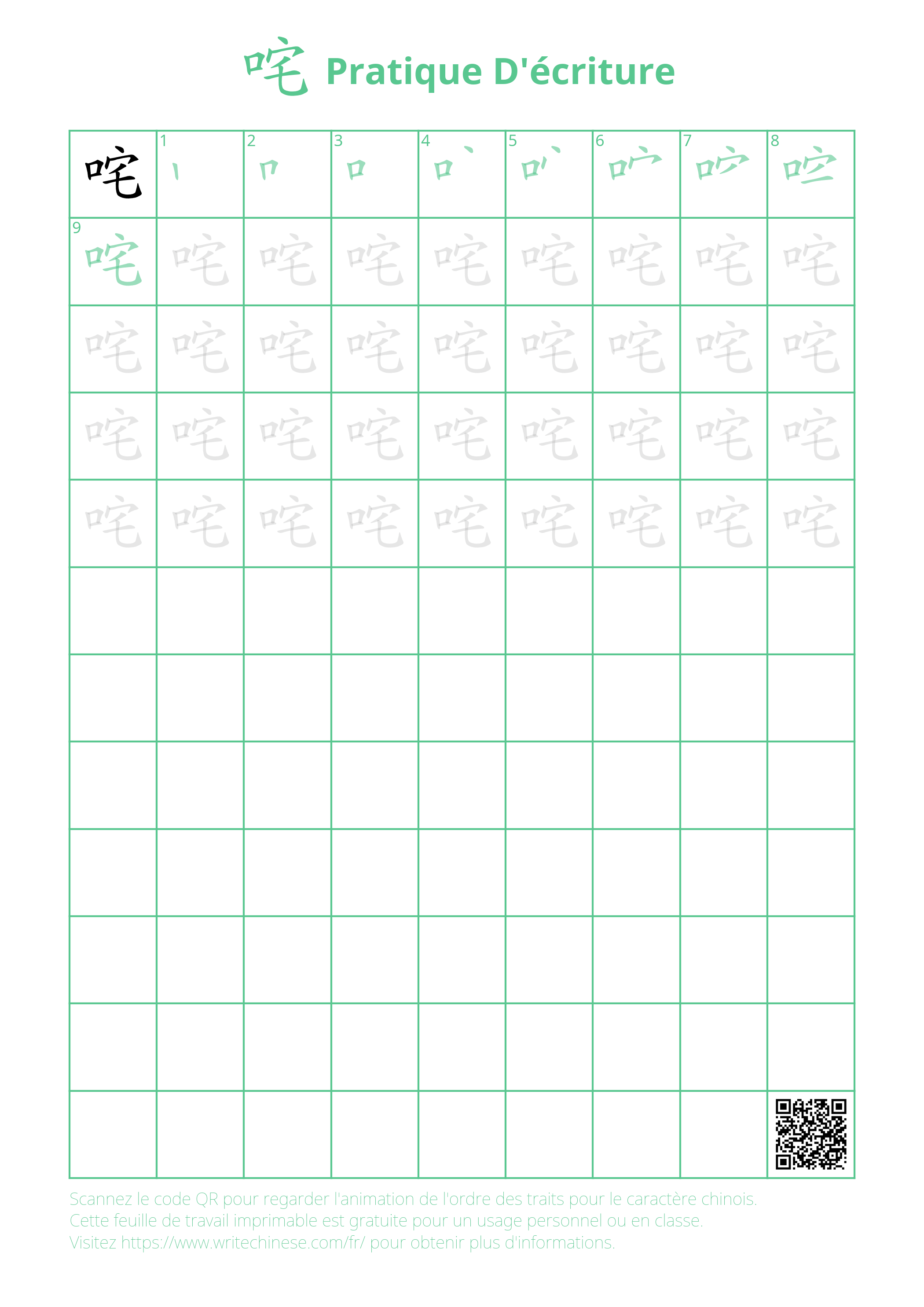 Apprenez la bonne manière d'écrire le caractère chinois '咤' grâce à un tutoriel vidéo avec un professeur de calligraphie. Suivez le guide étape par étape du maître de la calligraphie pour écrire le caractère chinois '咤'. Vous pouvez télécharger les fiches d'écriture manuscrite imprimables ci-dessous et pratiquer en écrivant avec un stylo et du papier.