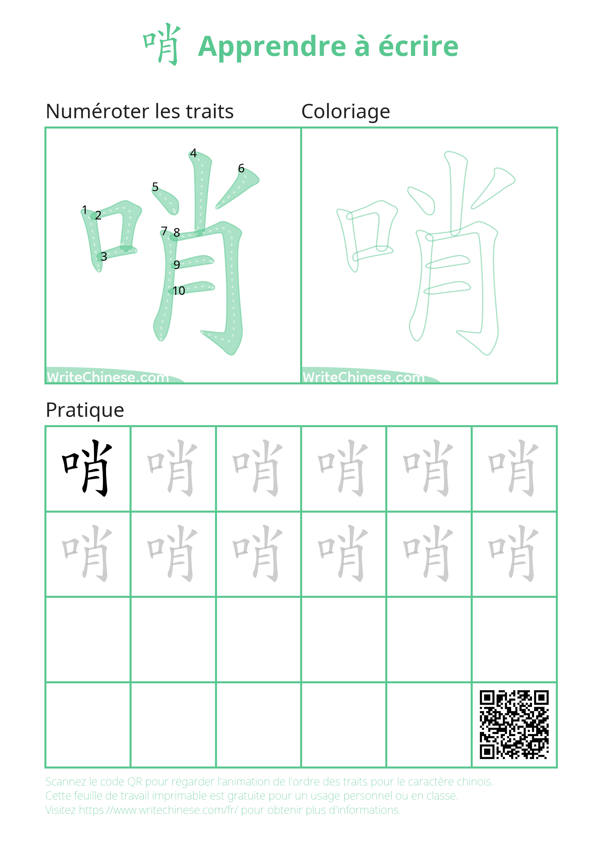 calligraphie pour écrire le caractère chinois '哨'. Vous pouvez télécharger les fiches