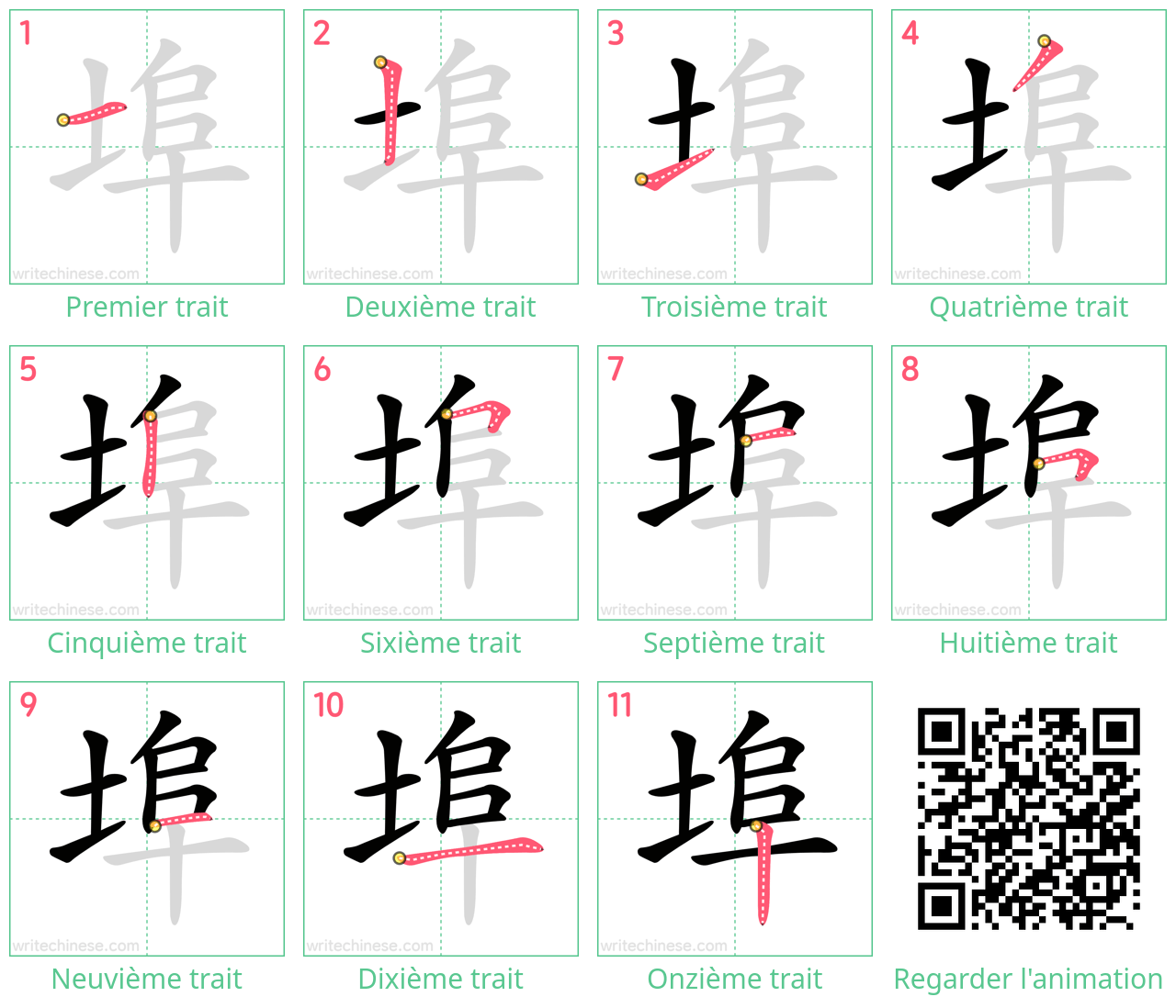 Apprenez à écrire le caractère chinois "埠" en regardant l'animation de l'ordre des traits de "埠".