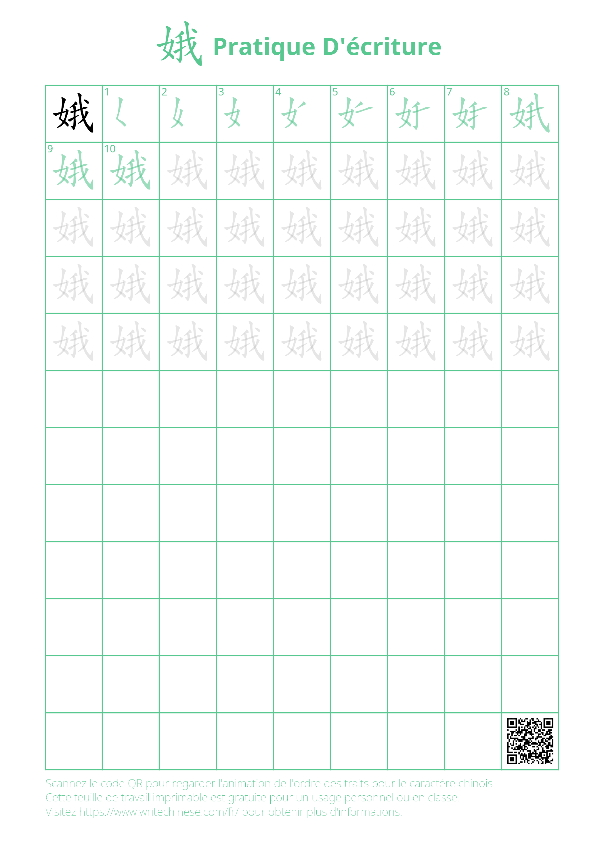 Feuilles d'exercices gratuites imprimables pour la pratique de l'écriture de 娥
