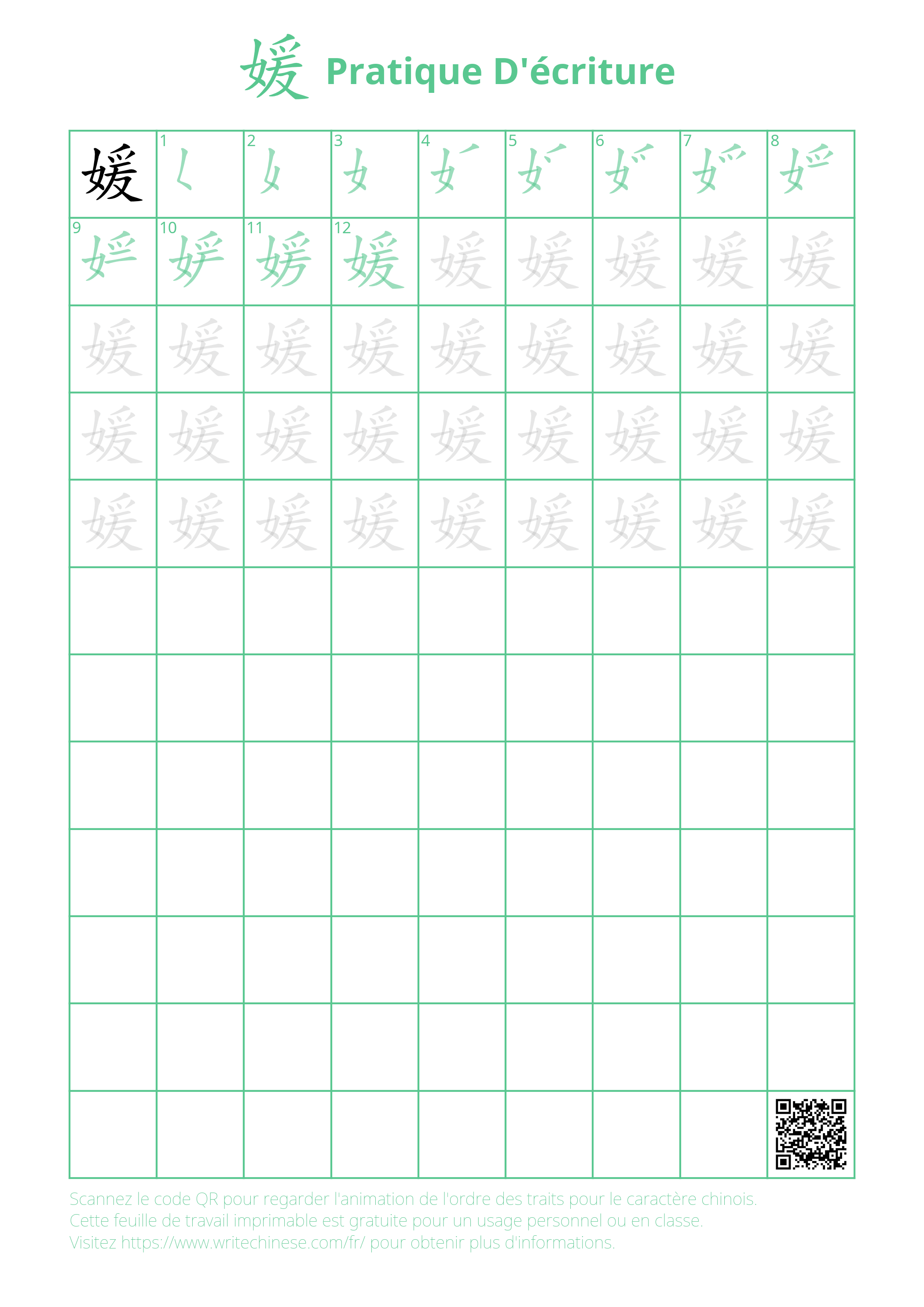 Apprenez la bonne manière d'écrire le caractère chinois '媛' grâce à un tutoriel vidéo avec un professeur de calligraphie. Suivez le guide étape par étape du maître de la calligraphie pour écrire le caractère chinois '媛'. Vous pouvez télécharger les fiches d'écriture manuscrite imprimables ci-dessous et pratiquer en écrivant avec un stylo et du papier.