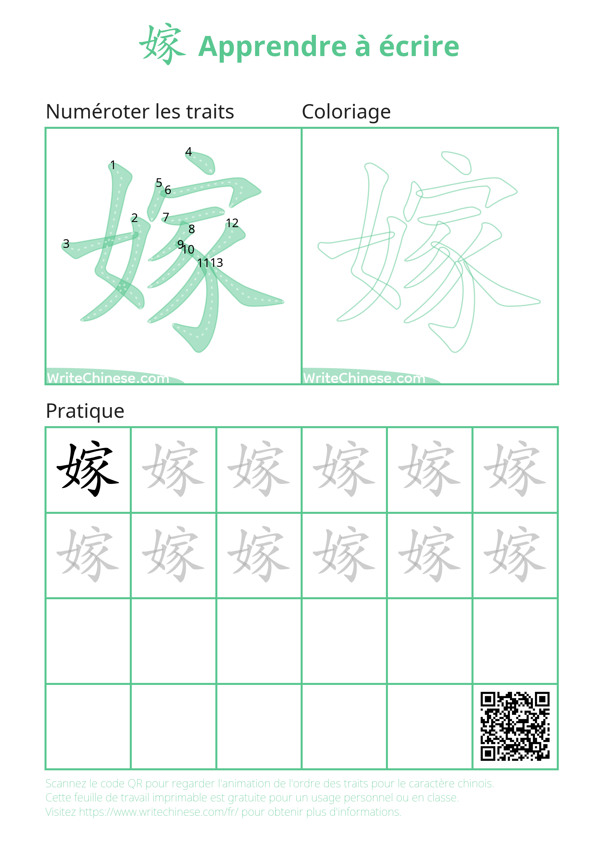 calligraphie pour écrire le caractère chinois '嫁'. Vous pouvez télécharger les fiches