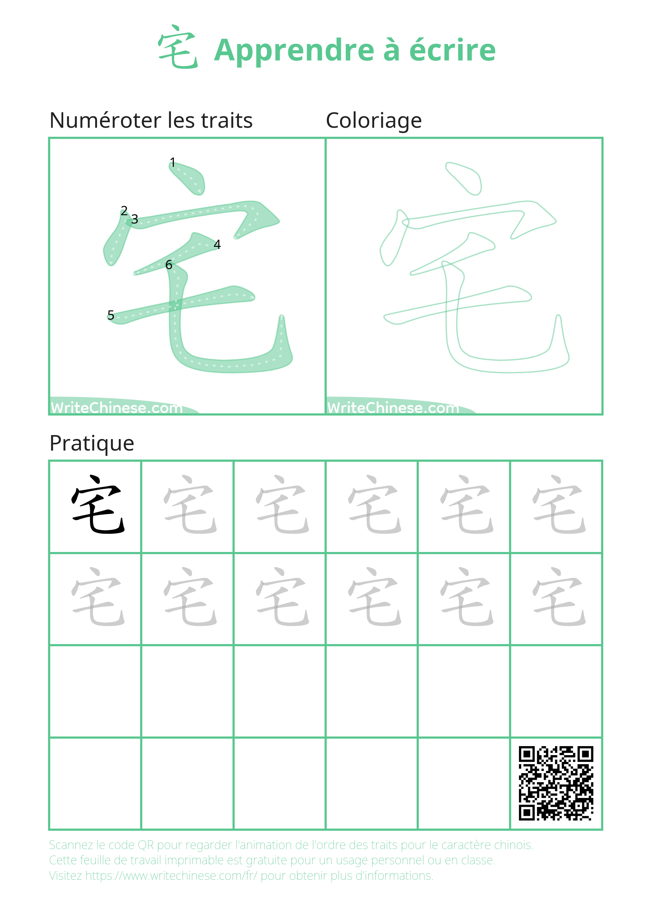 Apprenez la bonne manière d'écrire le caractère chinois '宅' grâce à un tutoriel vidéo avec un professeur de calligraphie. Suivez le guide étape par étape du maître de la calligraphie pour écrire le caractère chinois '宅'. Vous pouvez télécharger les fiches d'écriture manuscrite imprimables ci-dessous et pratiquer en écrivant avec un stylo et du papier.