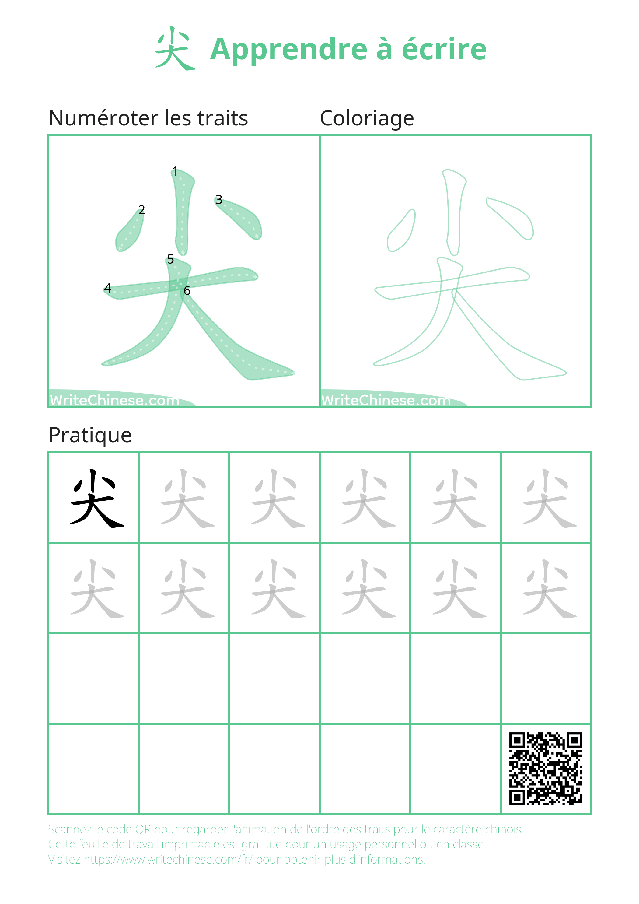 Feuille d'exercice imprimable pour la pratique de l'ordre des traits du caractère chinois 尖