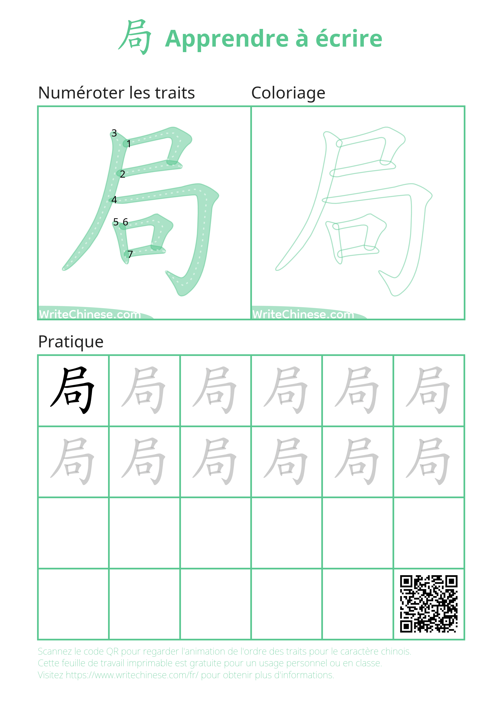 calligraphie pour écrire le caractère chinois '局'. Vous pouvez télécharger les fiches