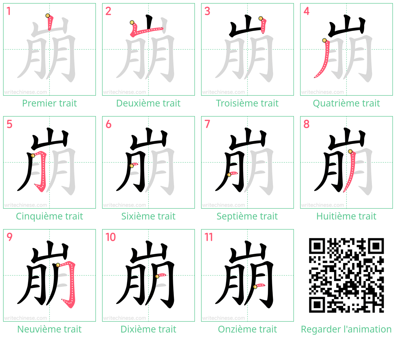 Maîtrisez le caractère chinois '崩' trait par trait grâce à des instructions visuelles
