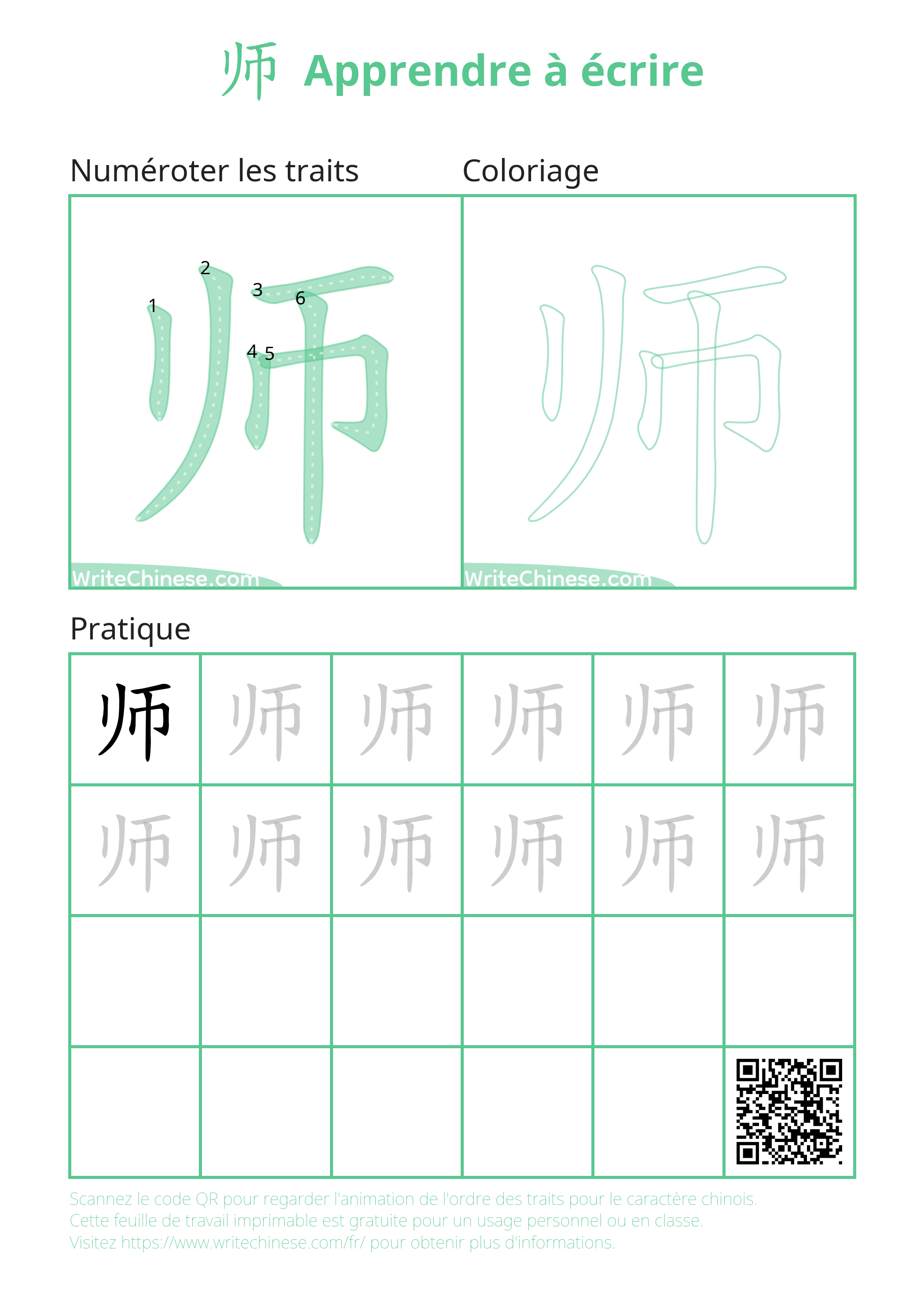 Apprenez la bonne manière d'écrire le caractère chinois '师' grâce à un tutoriel vidéo avec un professeur de calligraphie. Suivez le guide étape par étape du maître de la calligraphie pour écrire le caractère chinois '师'. Vous pouvez télécharger les fiches d'écriture manuscrite imprimables ci-dessous et pratiquer en écrivant avec un stylo et du papier.