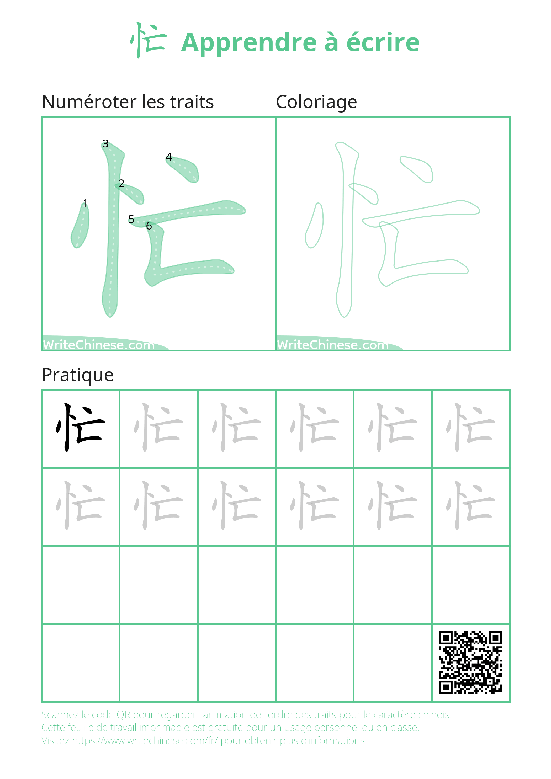Apprenez la bonne manière d'écrire le caractère chinois '忙' grâce à un tutoriel vidéo avec un professeur de calligraphie. Suivez le guide étape par étape du maître de la calligraphie pour écrire le caractère chinois '忙'. Vous pouvez télécharger les fiches d'écriture manuscrite imprimables ci-dessous et pratiquer en écrivant avec un stylo et du papier.