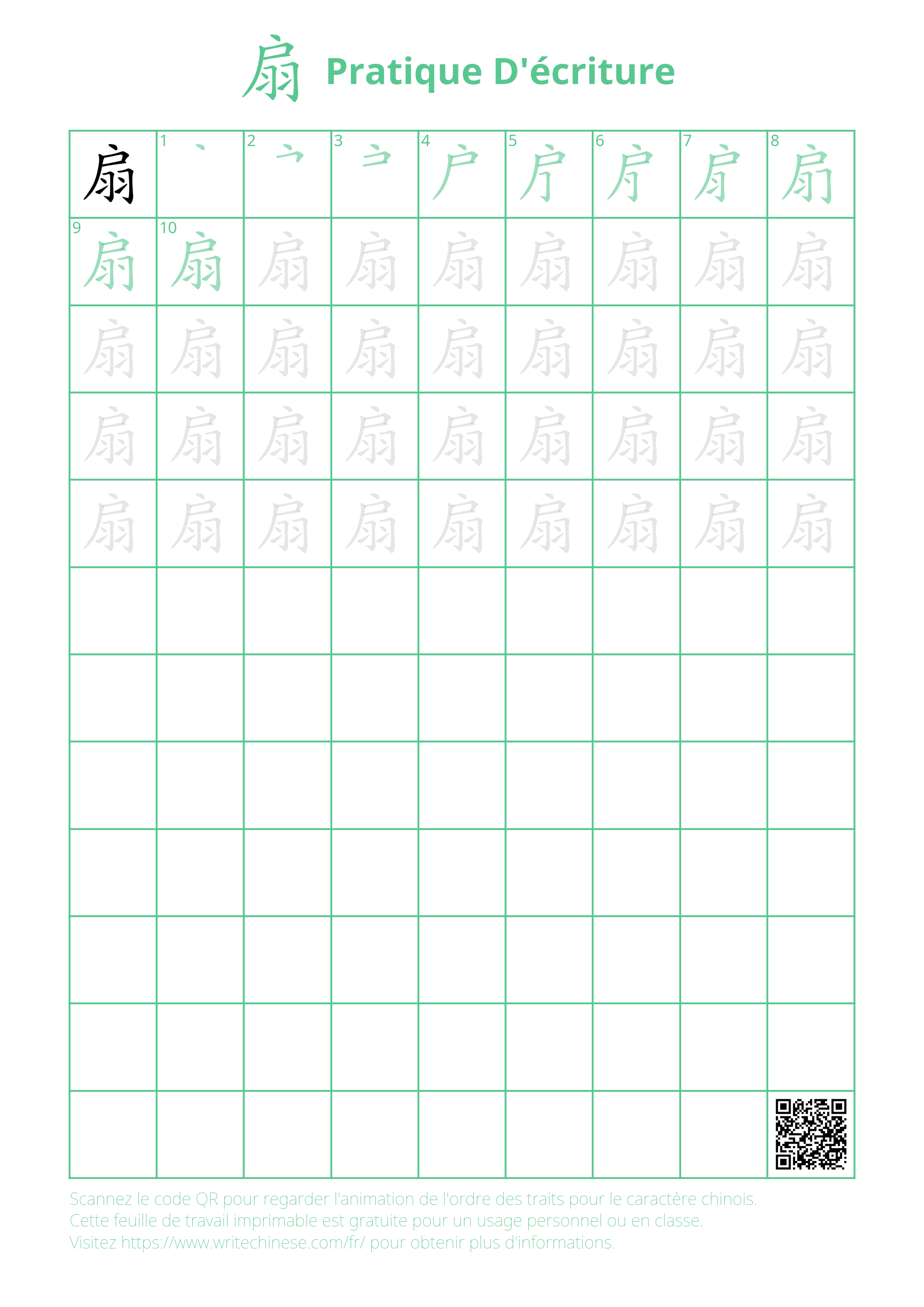 Apprenez la bonne manière d'écrire le caractère chinois '扇' grâce à un tutoriel vidéo avec un professeur de calligraphie. Suivez le guide étape par étape du maître de la calligraphie pour écrire le caractère chinois '扇'. Vous pouvez télécharger les fiches d'écriture manuscrite imprimables ci-dessous et pratiquer en écrivant avec un stylo et du papier.