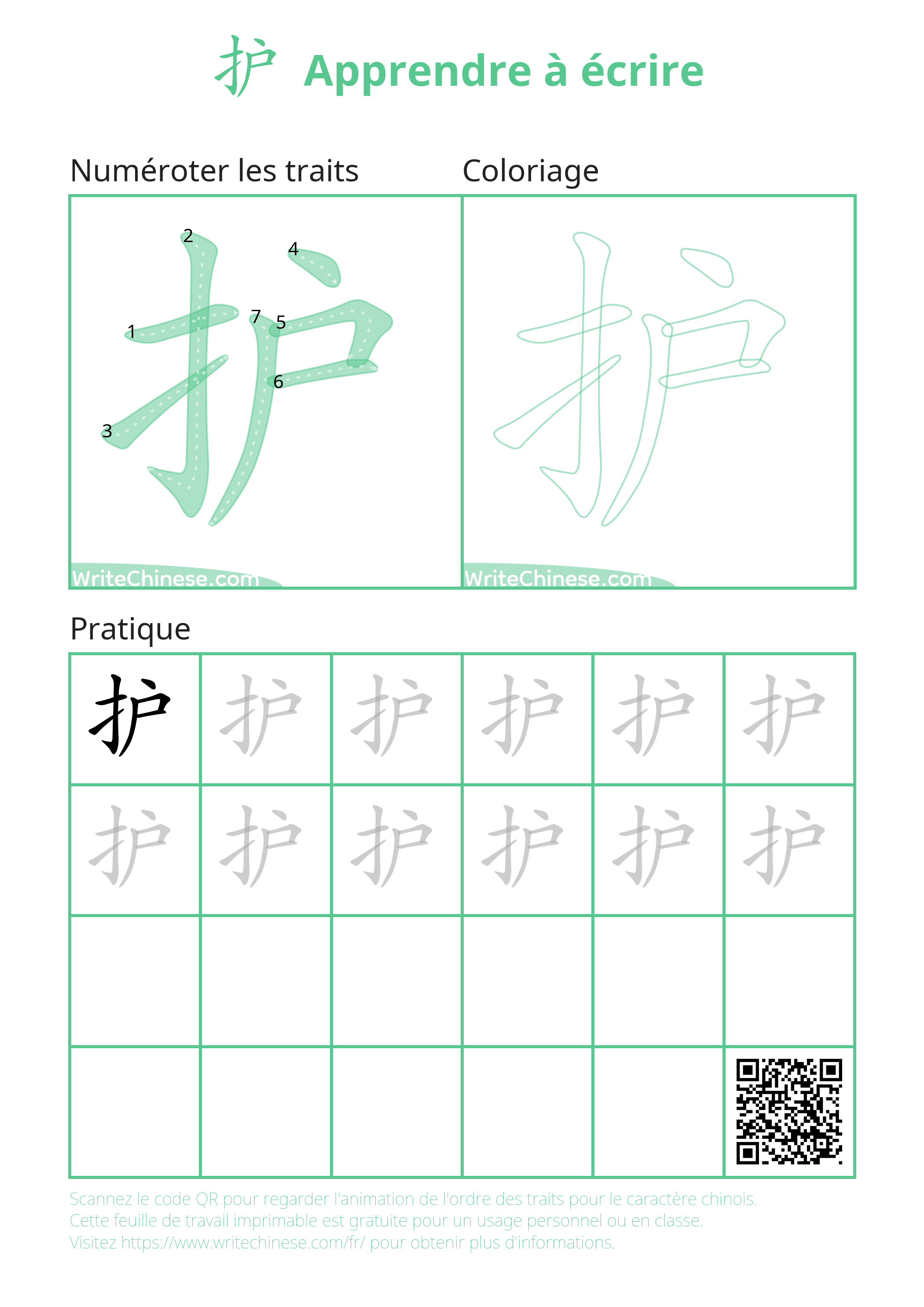 calligraphie pour écrire le caractère chinois '护'. Vous pouvez télécharger les fiches