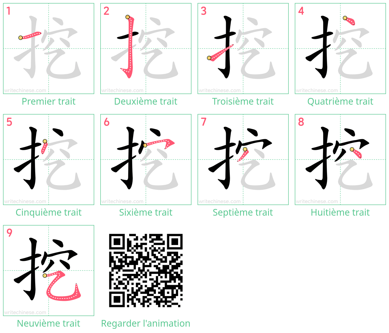 Maîtrisez le caractère chinois '挖' trait par trait grâce à des instructions visuelles