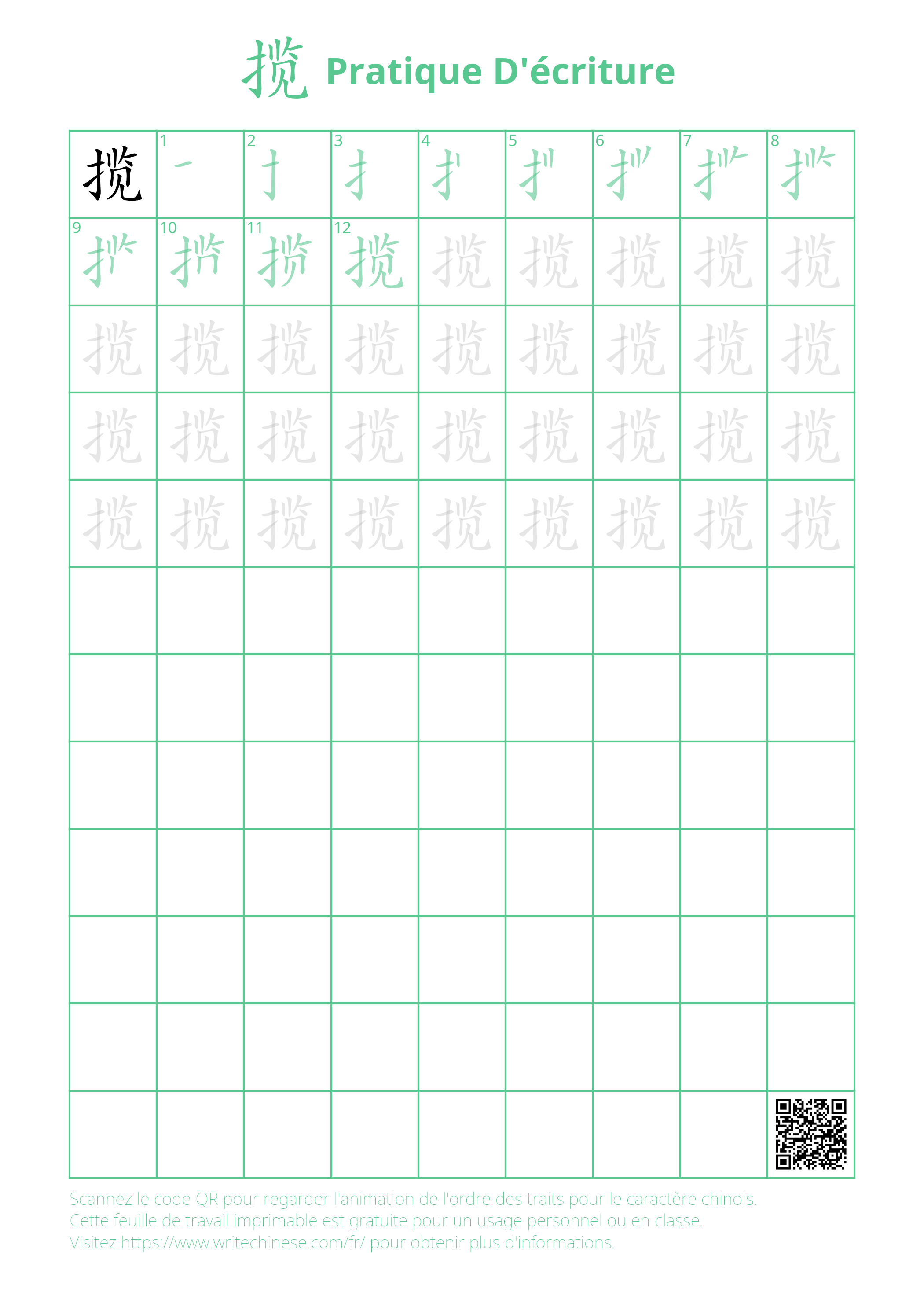 Feuille d'exercice imprimable pour la pratique de l'ordre des traits du caractère chinois 揽