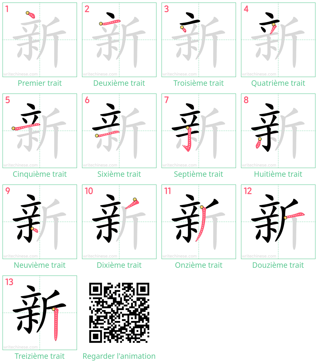 Apprenez à écrire le caractère chinois "新" en regardant l'animation de l'ordre des traits