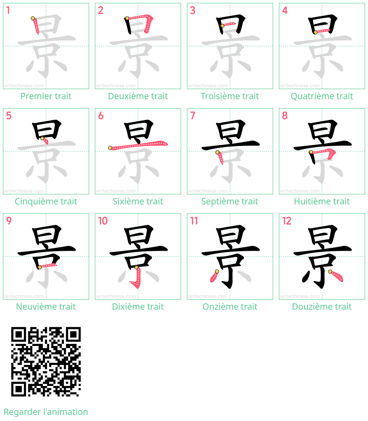 Apprenez à écrire le caractère chinois "景" en regardant l'animation de l'ordre des traits