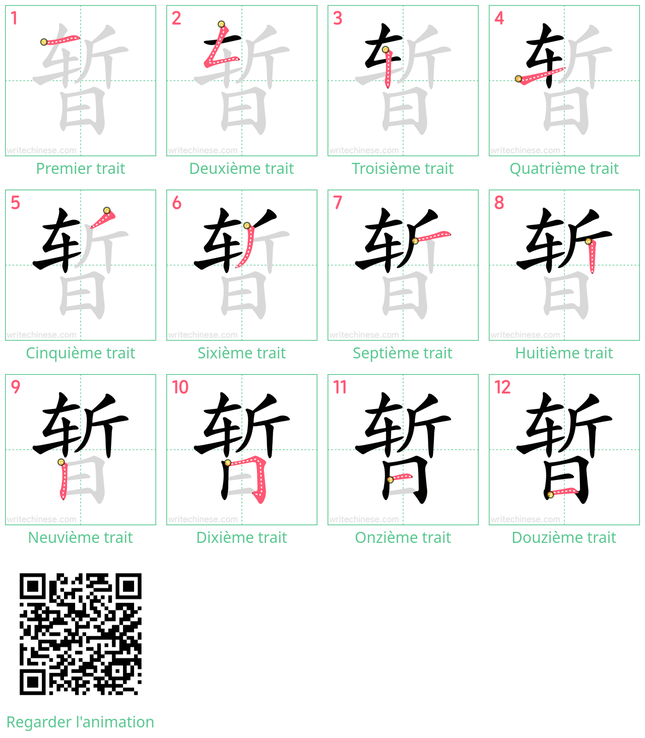 Apprenez à écrire le caractère chinois "暂" en regardant l'animation de l'ordre des traits