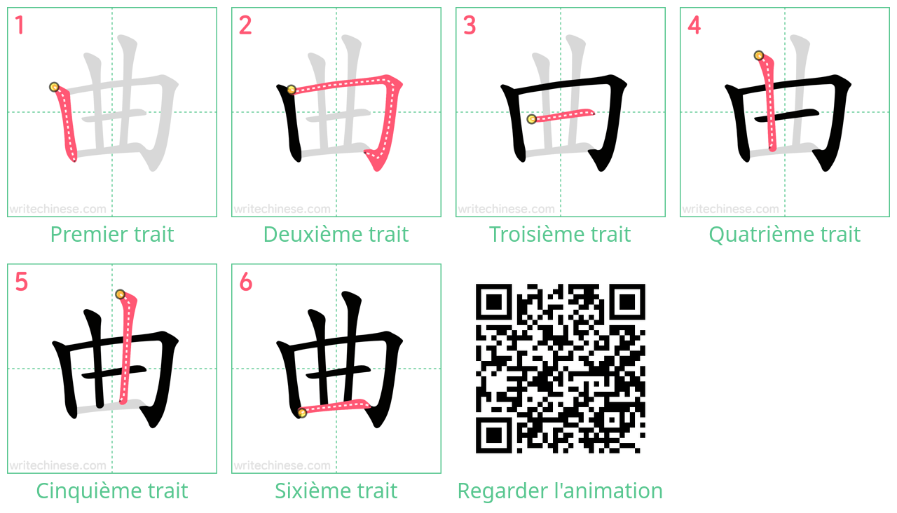 Apprenez à écrire le caractère chinois "曲" en regardant l'animation de l'ordre des traits