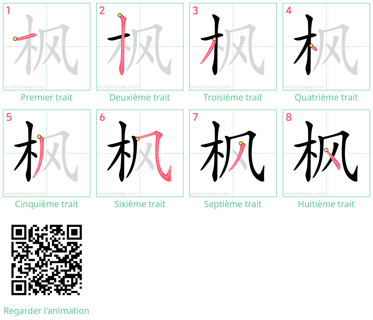 Apprenez à écrire le caractère chinois "枫" en regardant l'animation de l'ordre des traits de "枫".