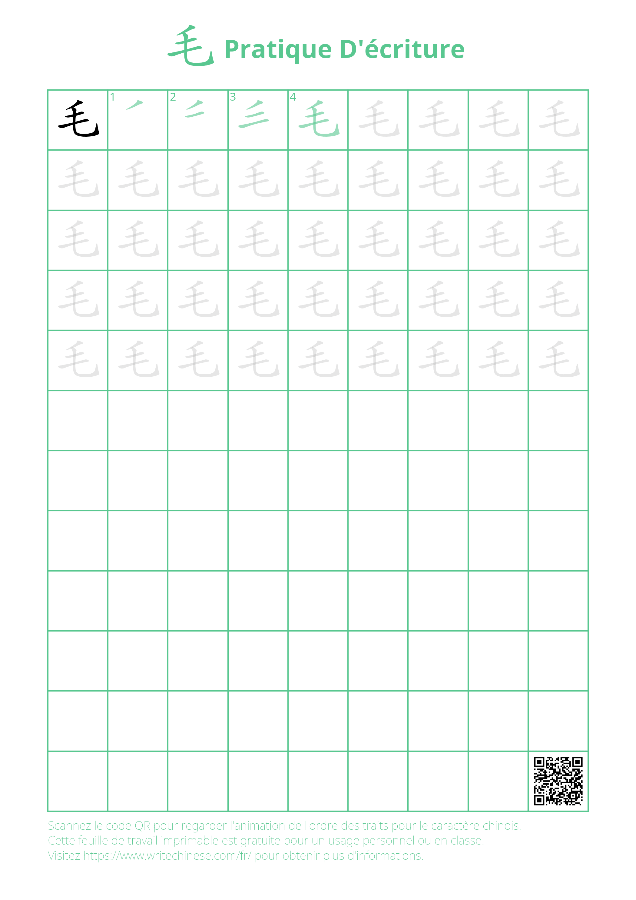 Feuilles d'exercices gratuites imprimables pour la pratique de l'écriture de 毛