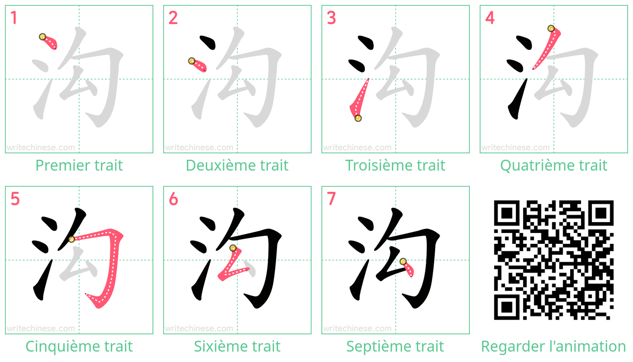 Apprenez à écrire le caractère chinois "沟" en regardant l'animation de l'ordre des traits de "沟".