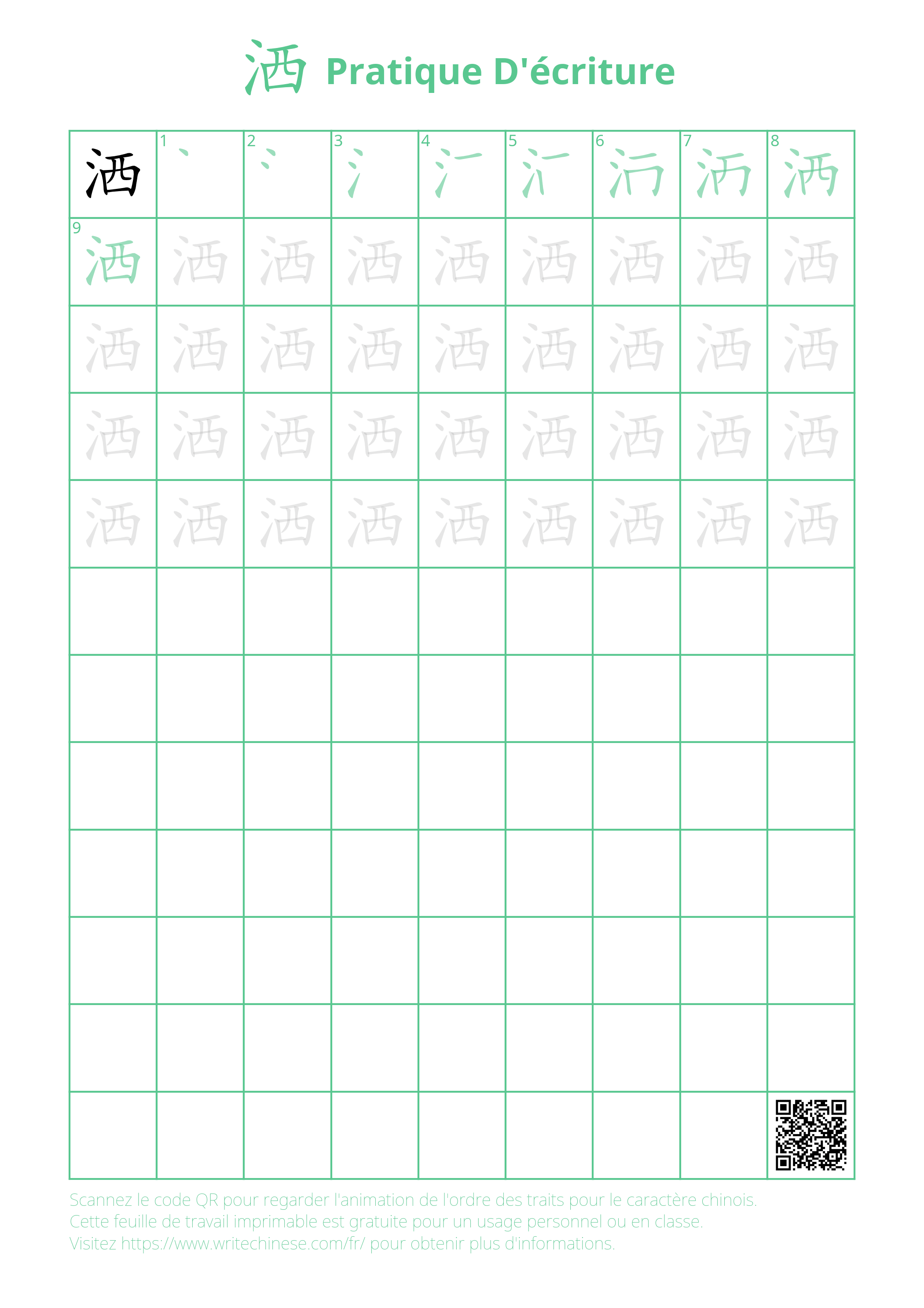 Apprenez la bonne manière d'écrire le caractère chinois '洒' grâce à un tutoriel vidéo avec un professeur de calligraphie. Suivez le guide étape par étape du maître de la calligraphie pour écrire le caractère chinois '洒'. Vous pouvez télécharger les fiches d'écriture manuscrite imprimables ci-dessous et pratiquer en écrivant avec un stylo et du papier.