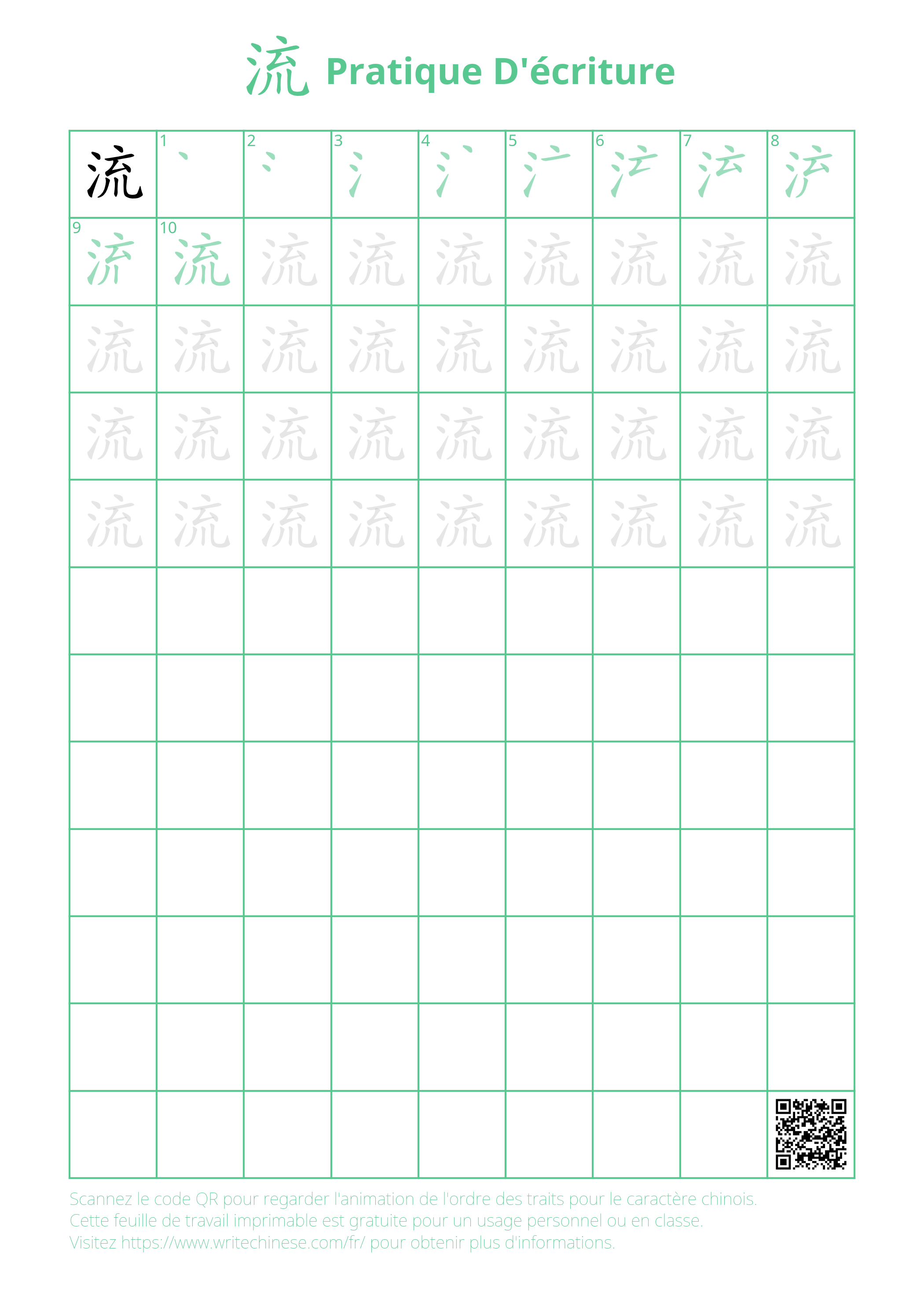 Apprenez la bonne manière d'écrire le caractère chinois '流' grâce à un tutoriel vidéo avec un professeur de calligraphie. Suivez le guide étape par étape du maître de la calligraphie pour écrire le caractère chinois '流'. Vous pouvez télécharger les fiches d'écriture manuscrite imprimables ci-dessous et pratiquer en écrivant avec un stylo et du papier.