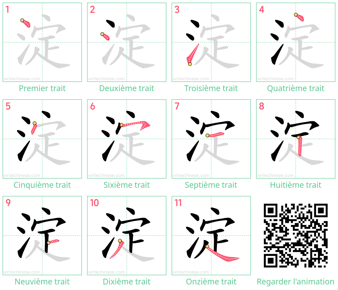 Apprenez à écrire le caractère chinois "淀" en regardant l'animation de l'ordre des traits de "淀".
