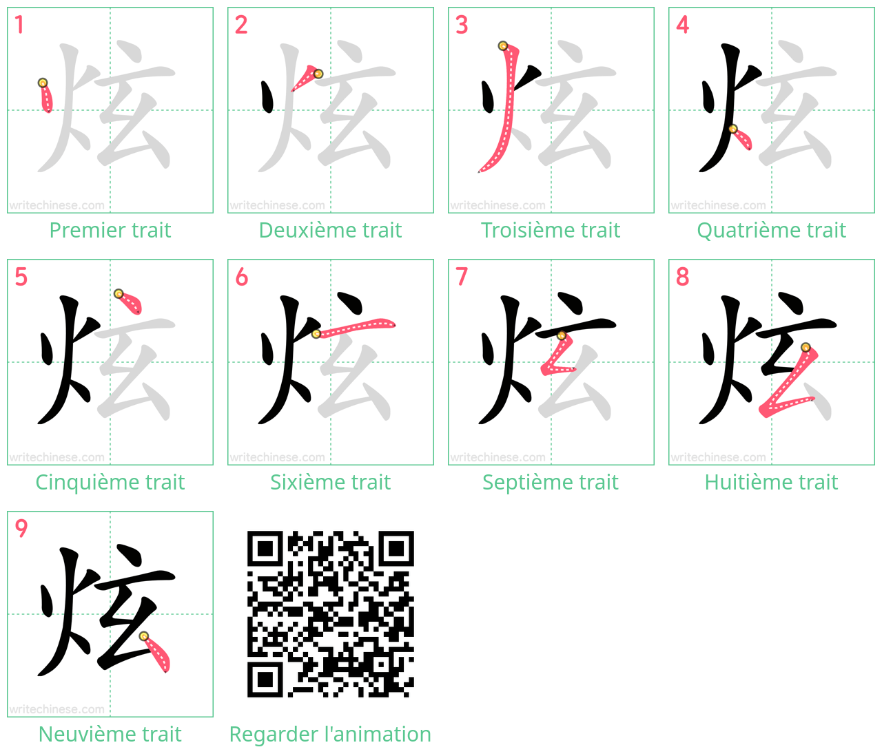 Apprenez à écrire le caractère chinois "炫" en regardant l'animation de l'ordre des traits de "炫".