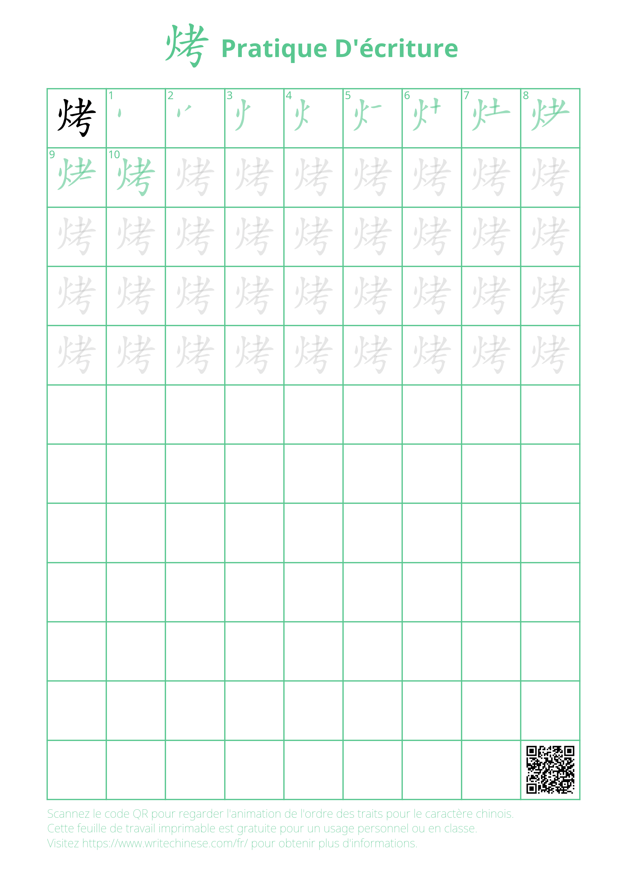 Feuille d'exercice imprimable pour la pratique de l'écriture du caractère chinois 烤