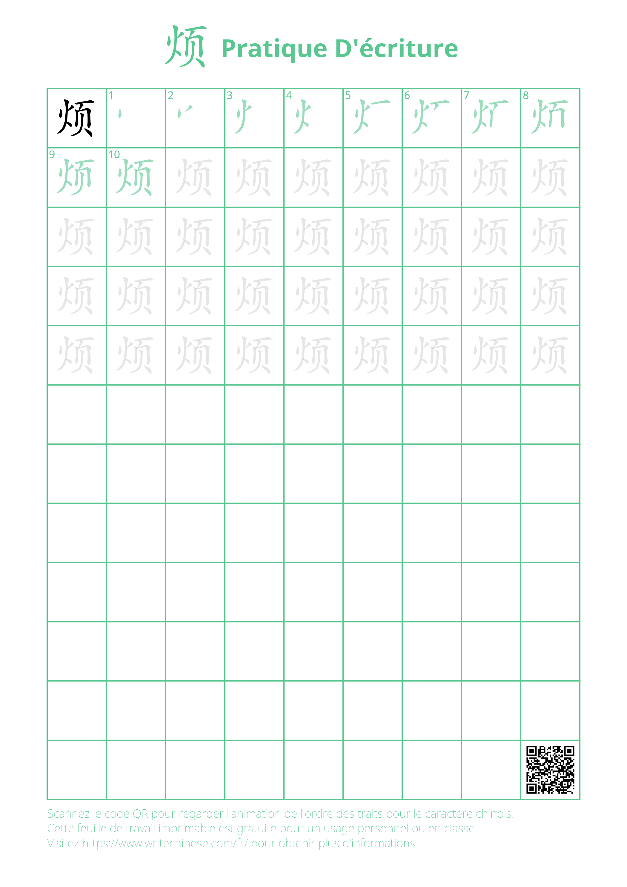 Feuille d'exercice imprimable pour la pratique de l'ordre des traits du caractère chinois 烦