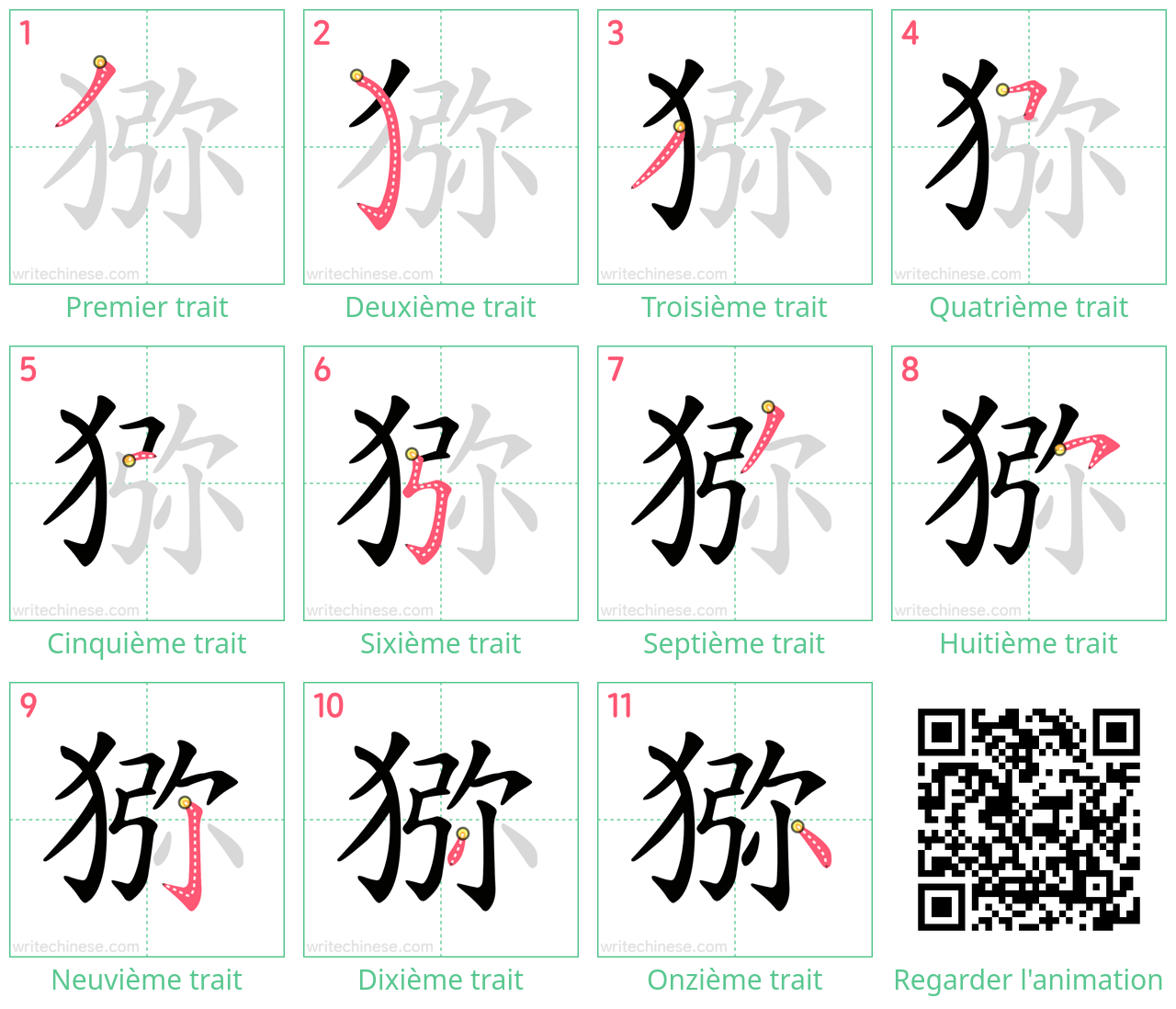 Maîtrisez le caractère chinois '猕' trait par trait grâce à des instructions visuelles