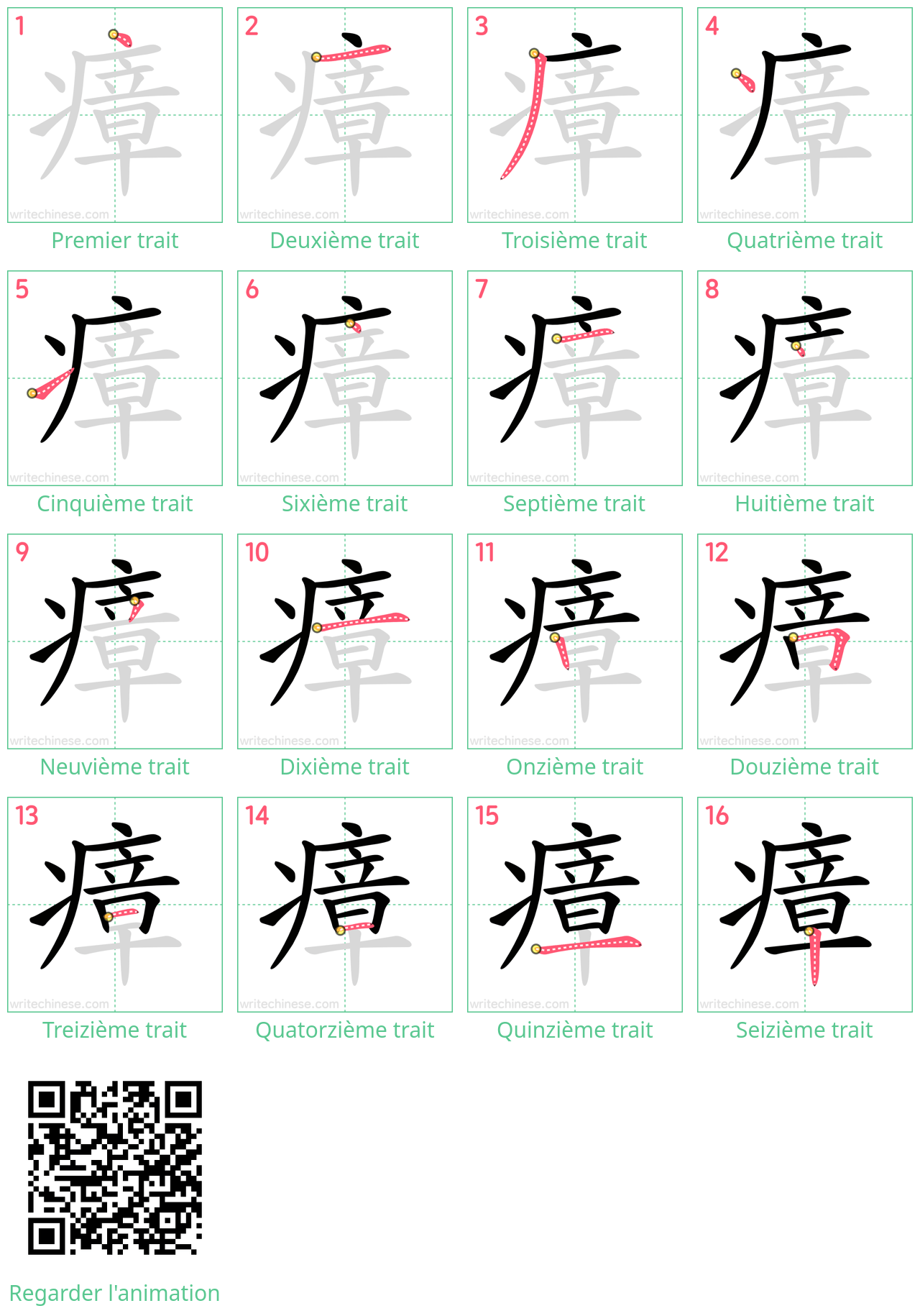 Apprenez à écrire le caractère chinois "瘴" en regardant l'animation de l'ordre des traits de "瘴".