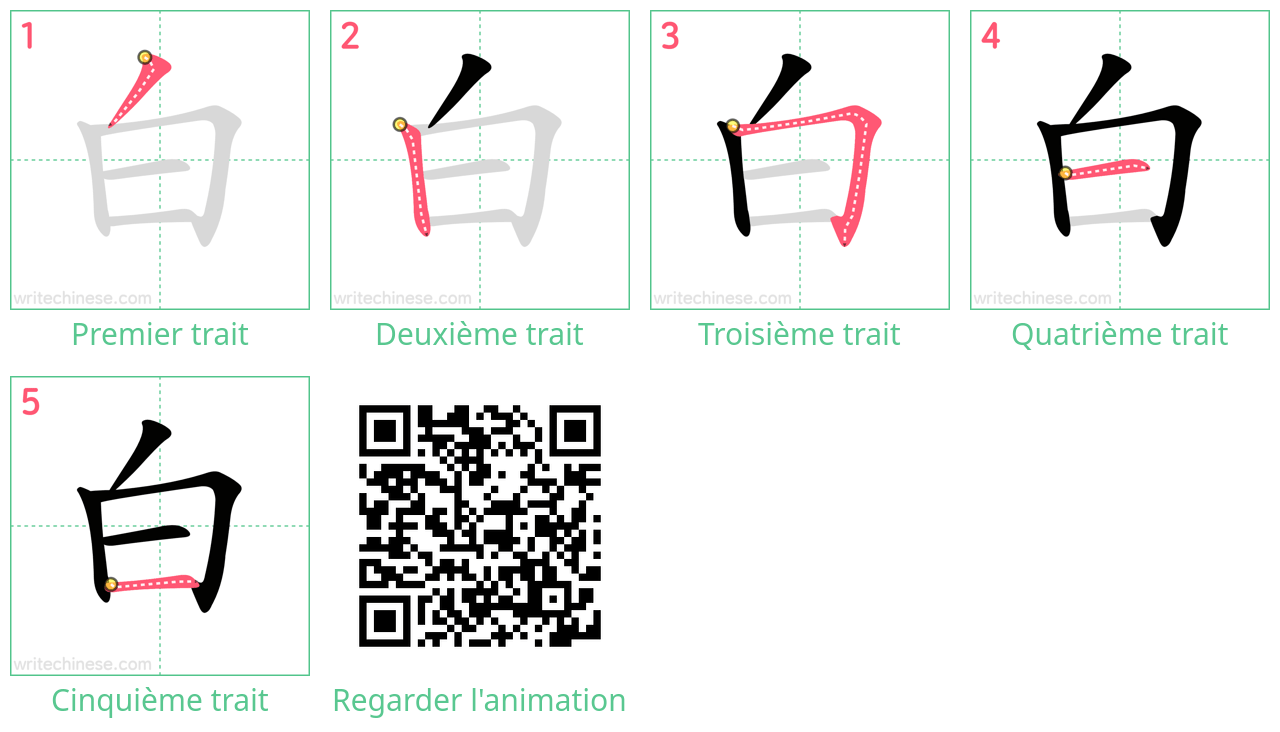 Apprenez à écrire le caractère chinois "白" en regardant l'animation de l'ordre des traits