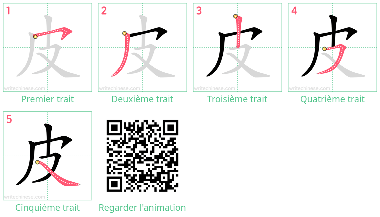 Apprenez à écrire le caractère chinois "皮" en regardant l'animation de l'ordre des traits