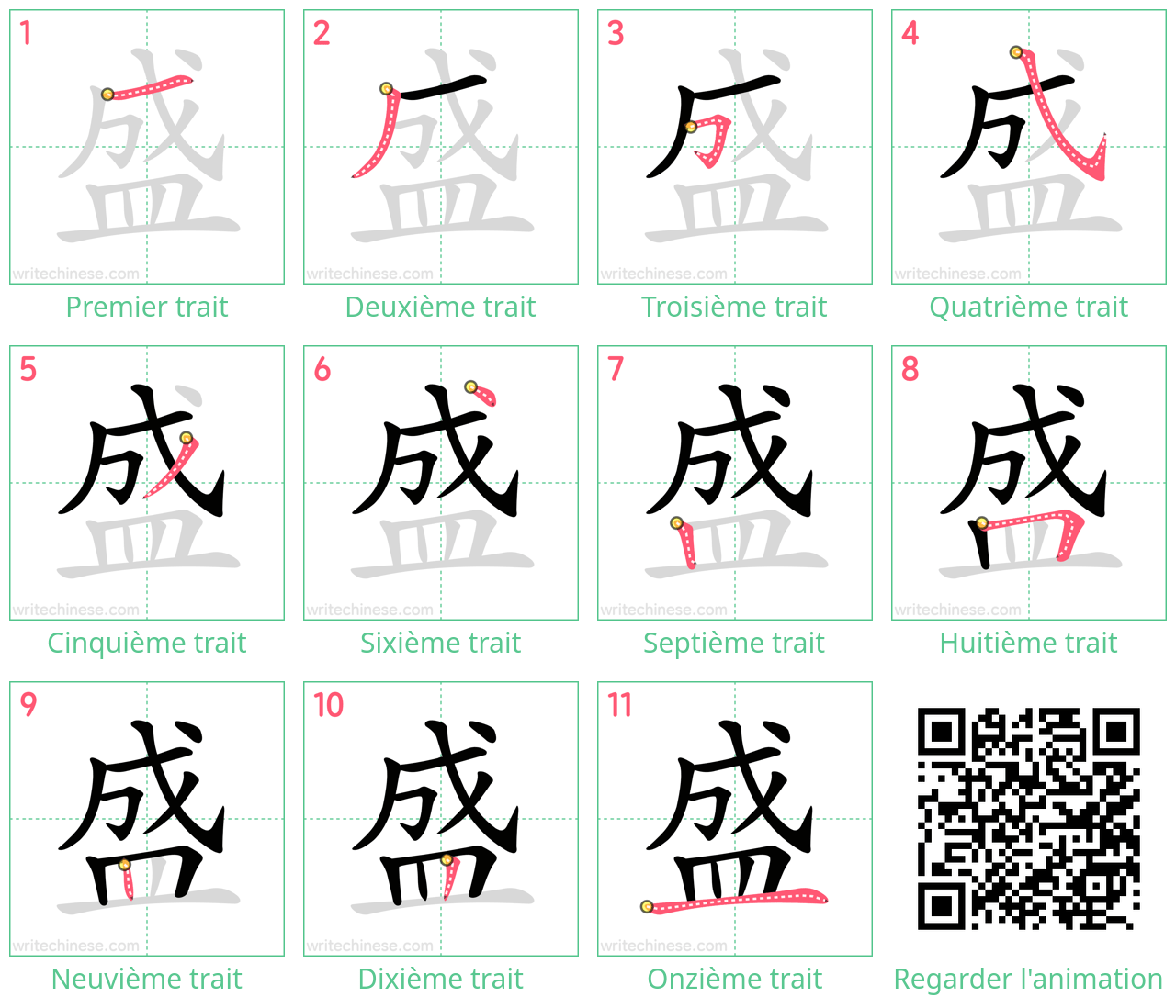 Apprenez à écrire le caractère chinois "盛" en regardant l'animation de l'ordre des traits