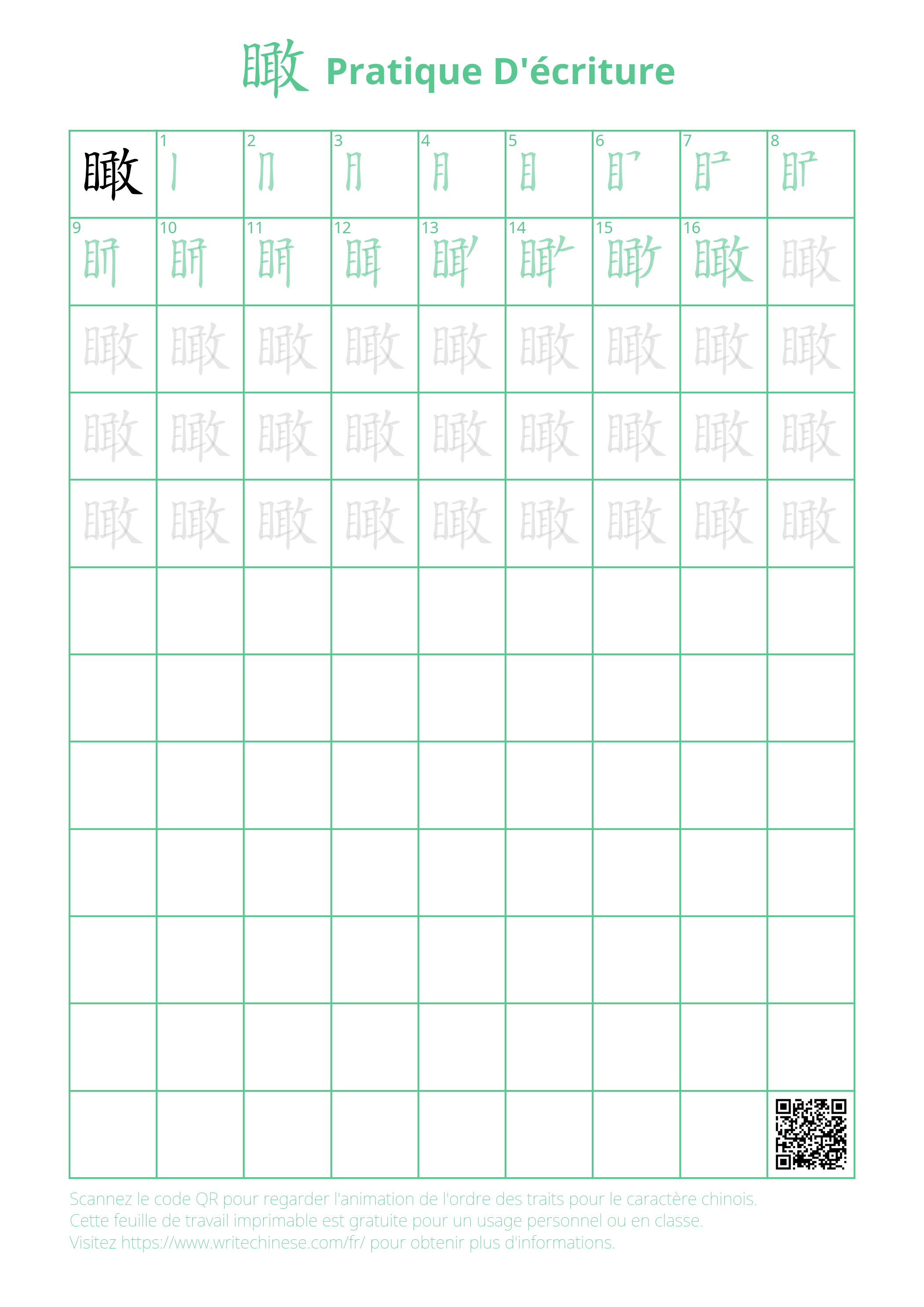Apprenez la bonne manière d'écrire le caractère chinois '瞰' grâce à un tutoriel vidéo avec un professeur de calligraphie. Suivez le guide étape par étape du maître de la calligraphie pour écrire le caractère chinois '瞰'. Vous pouvez télécharger les fiches d'écriture manuscrite imprimables ci-dessous et pratiquer en écrivant avec un stylo et du papier.