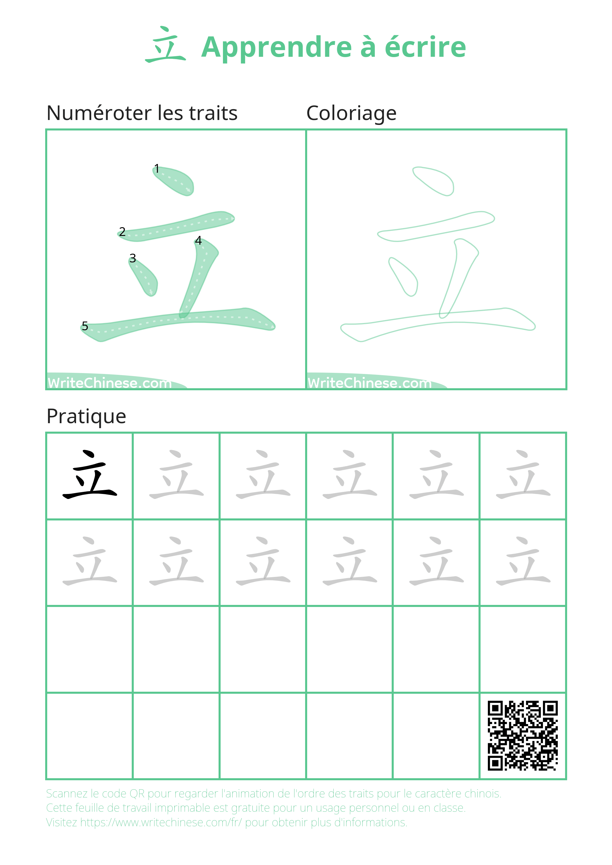 Feuille d'exercice imprimable pour la pratique de l'ordre des traits du caractère chinois 立